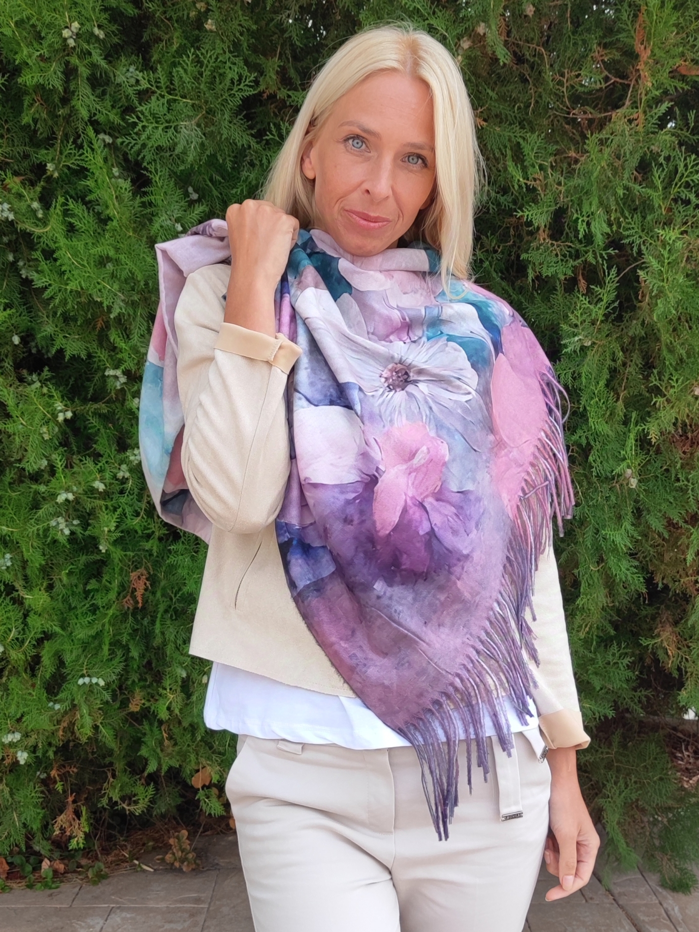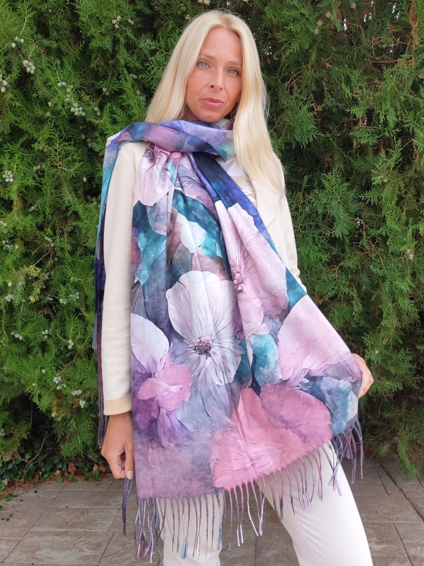 Добавете цвят и изящество към своя стил с този елегантен дамски шал с художествен флорален принт. Мека, лека и приятна на допир, материята пада красиво и позволява шала да бъде носен както в ежедневието, така и като акцент към по-елегантна визия.