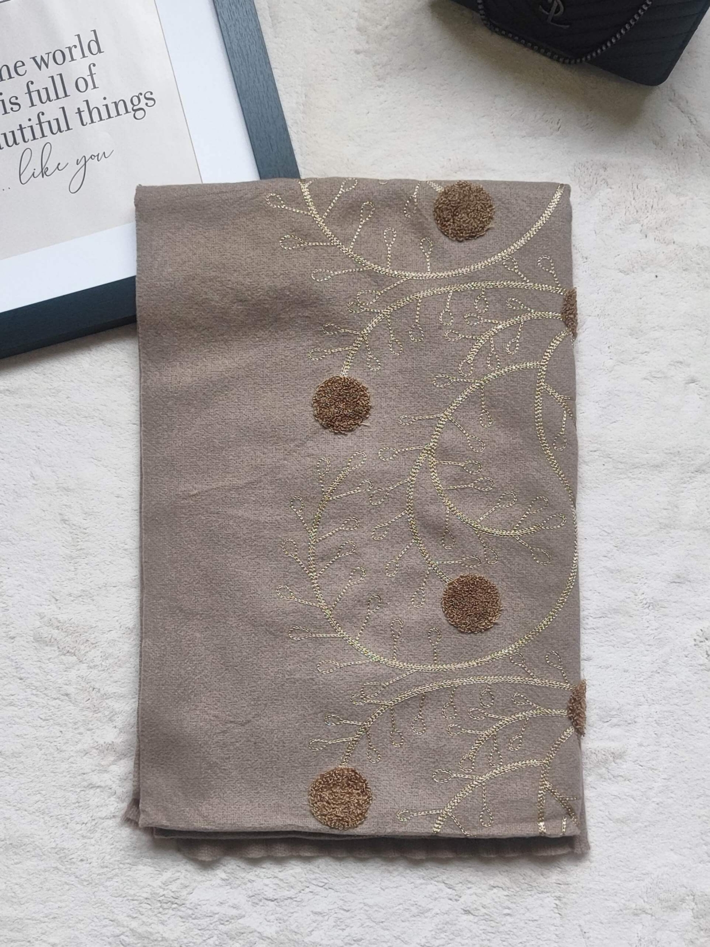 Ключови думи : зимен шал вискоза, дамски шал със златиста бродерия, елегантен зимен шал, бежов шал, шал за зима, луксозен дамски шал.