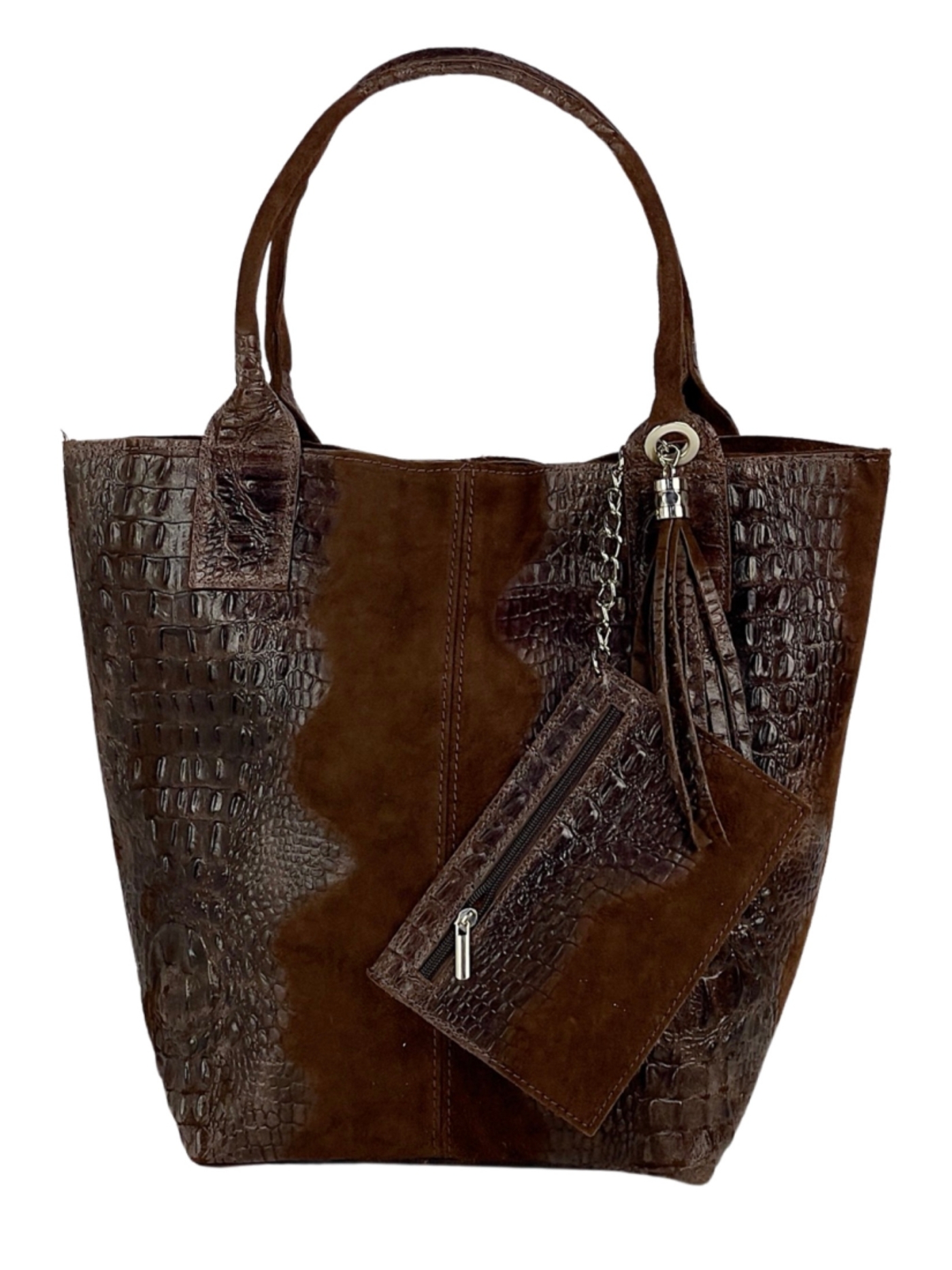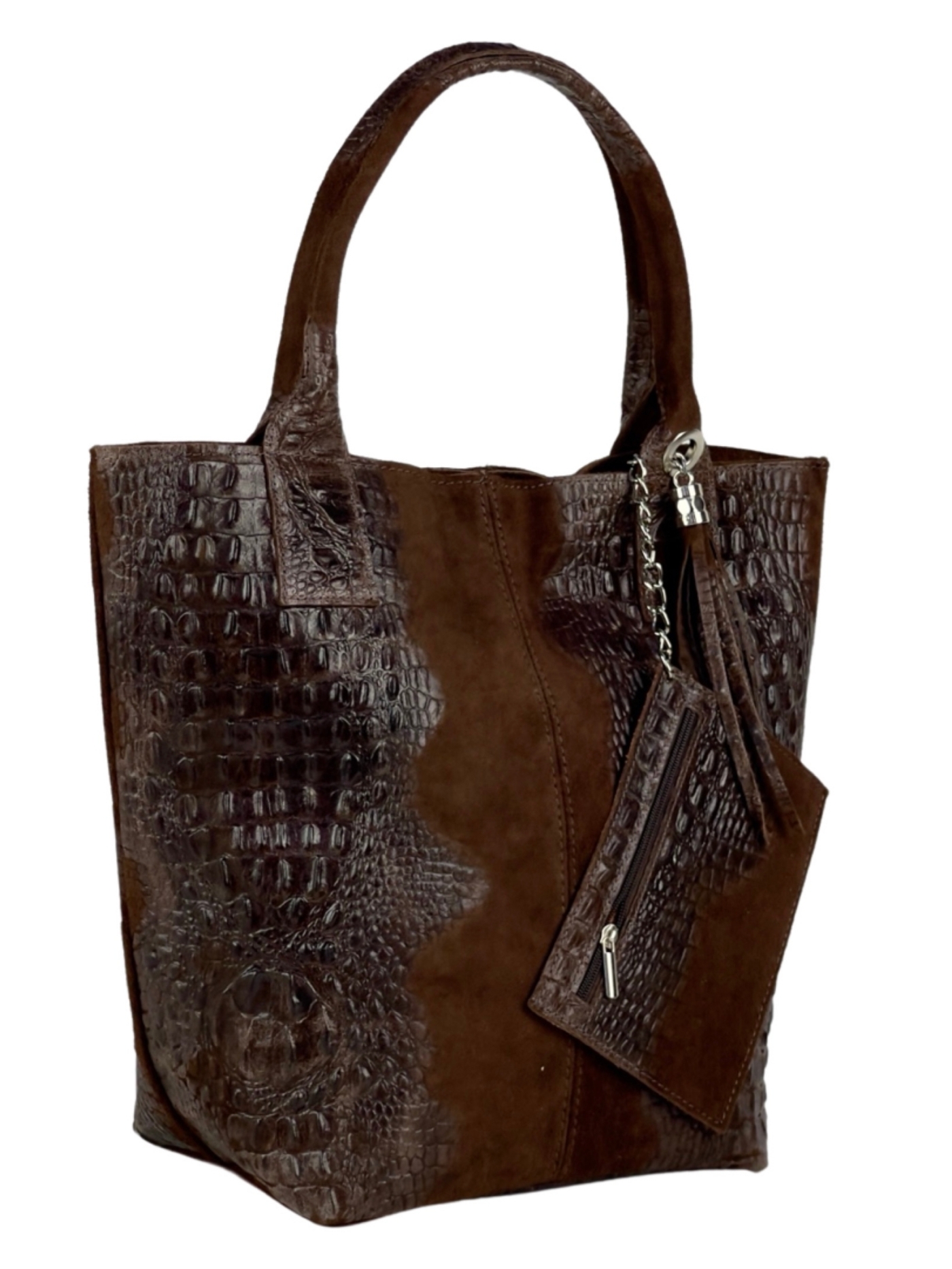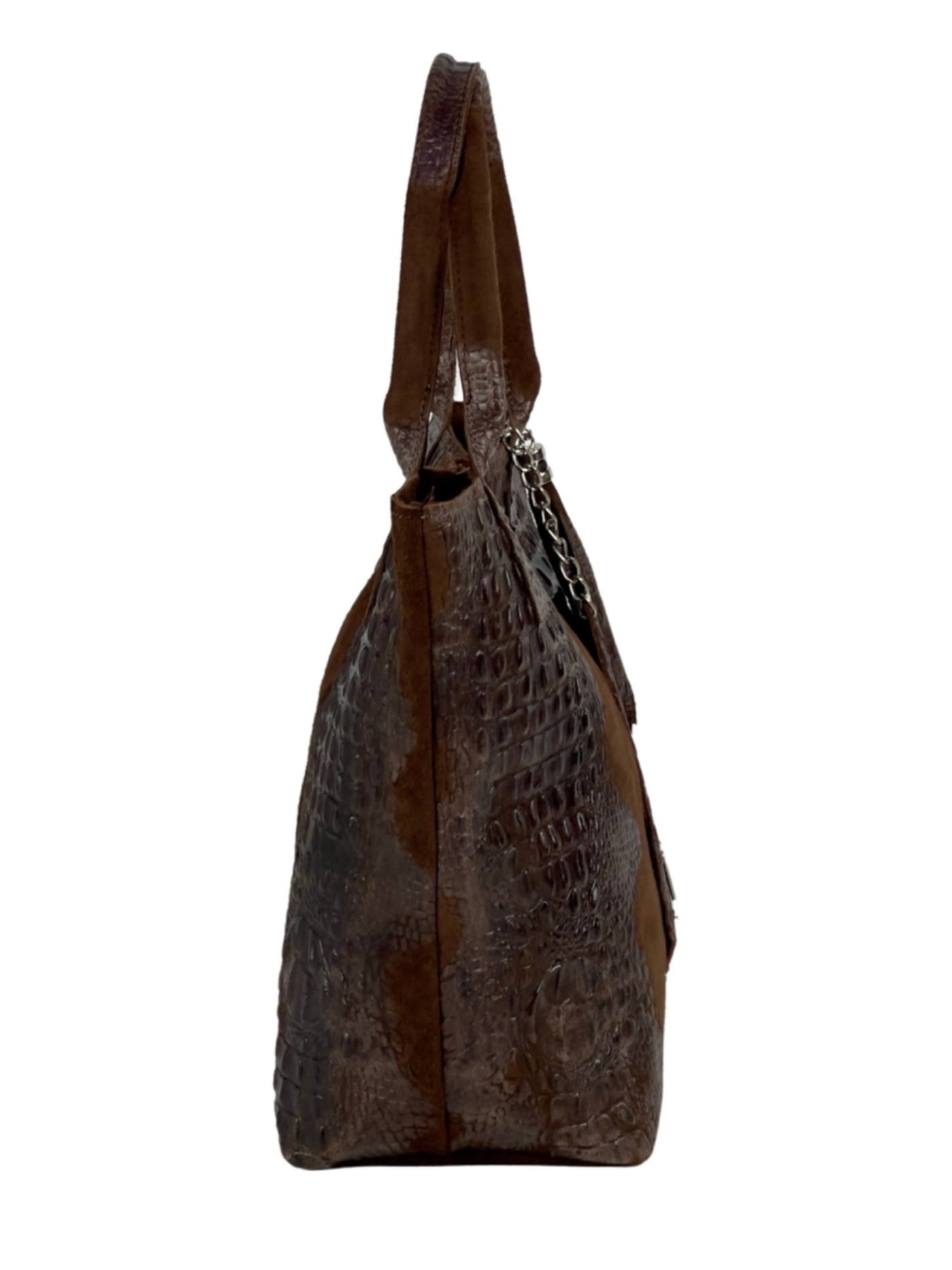 Елегантна дамска чанта изработена от комбинация от естествена кожа и велур с ефектна крокодилска щампа.