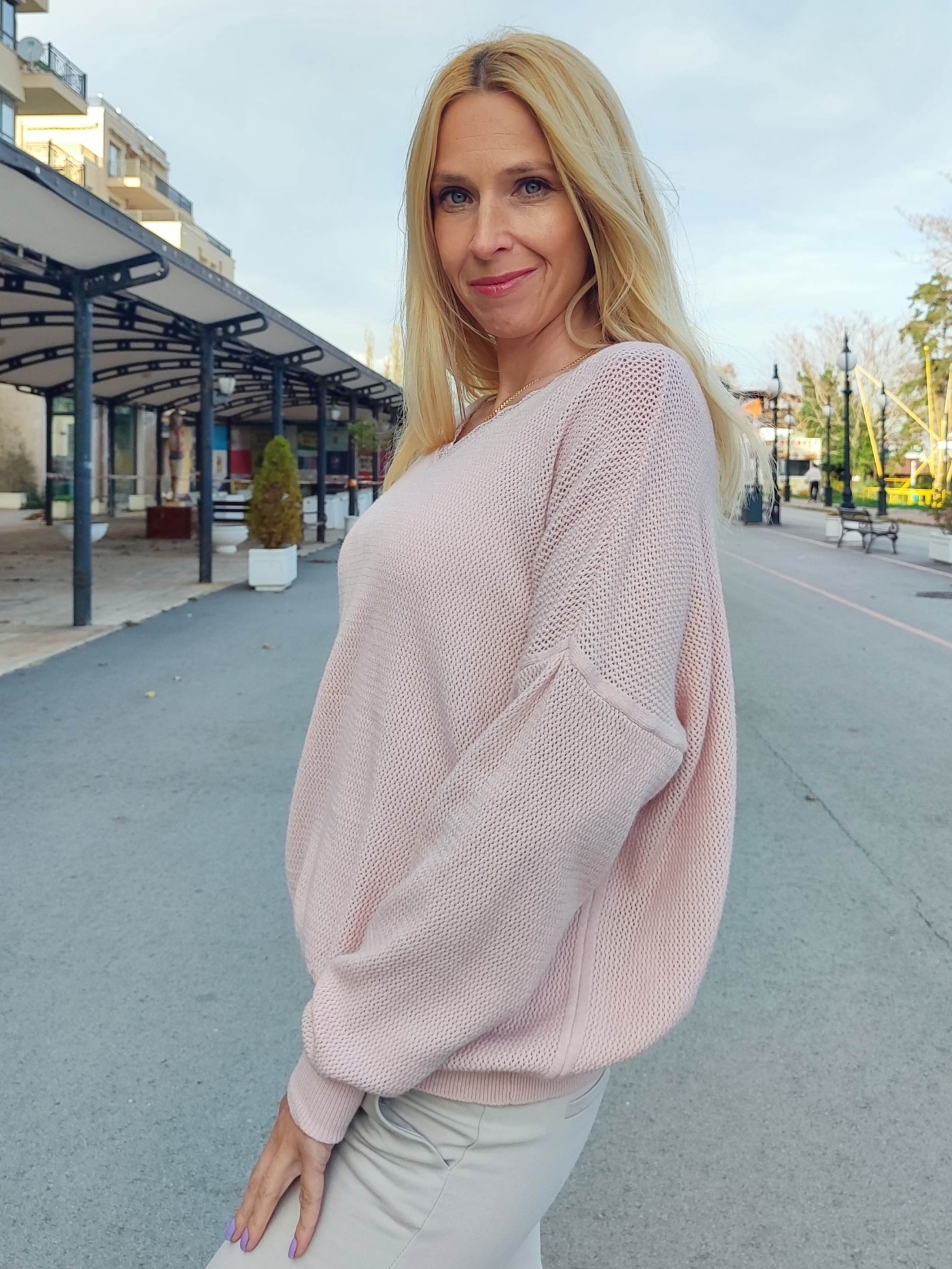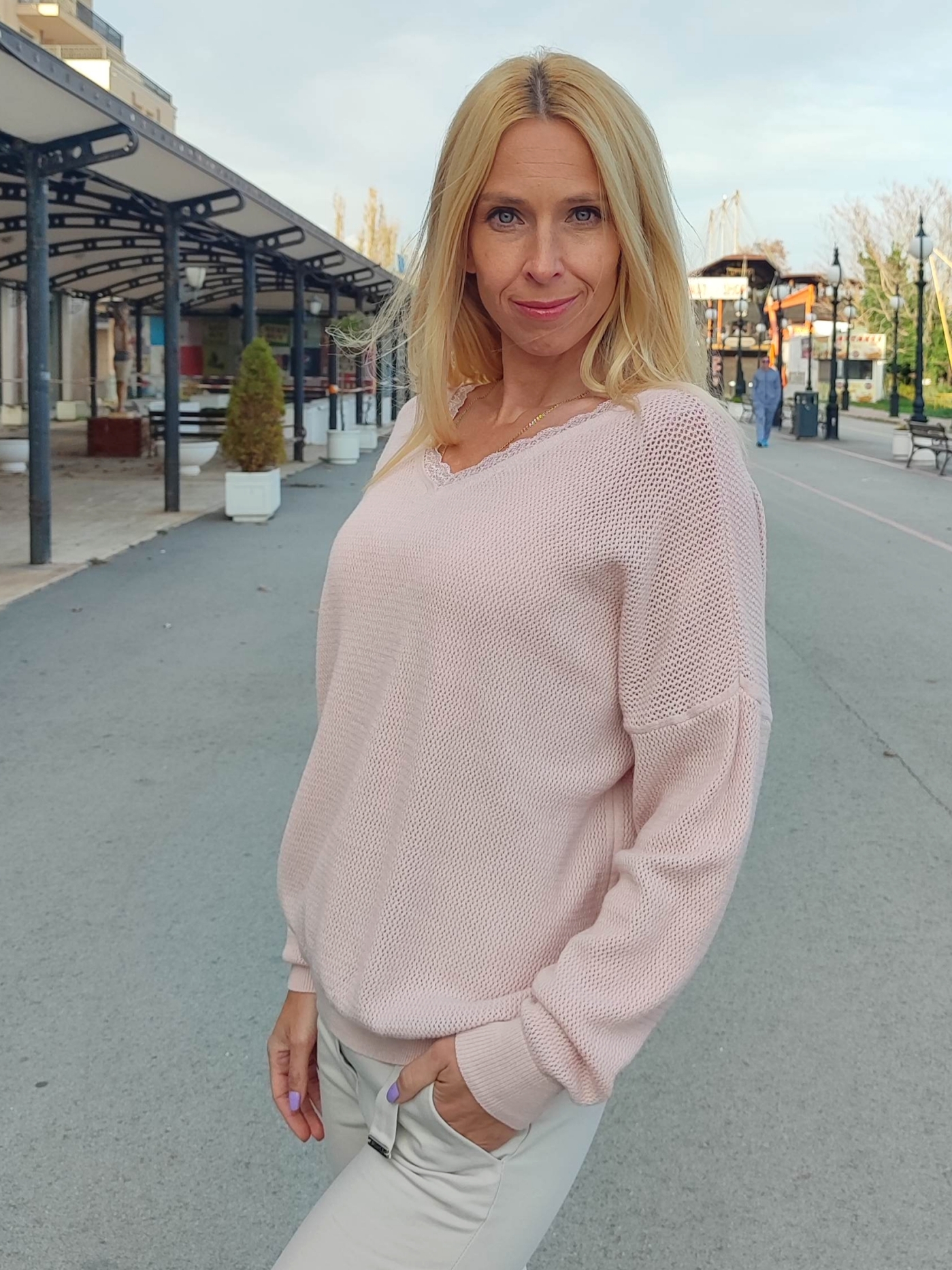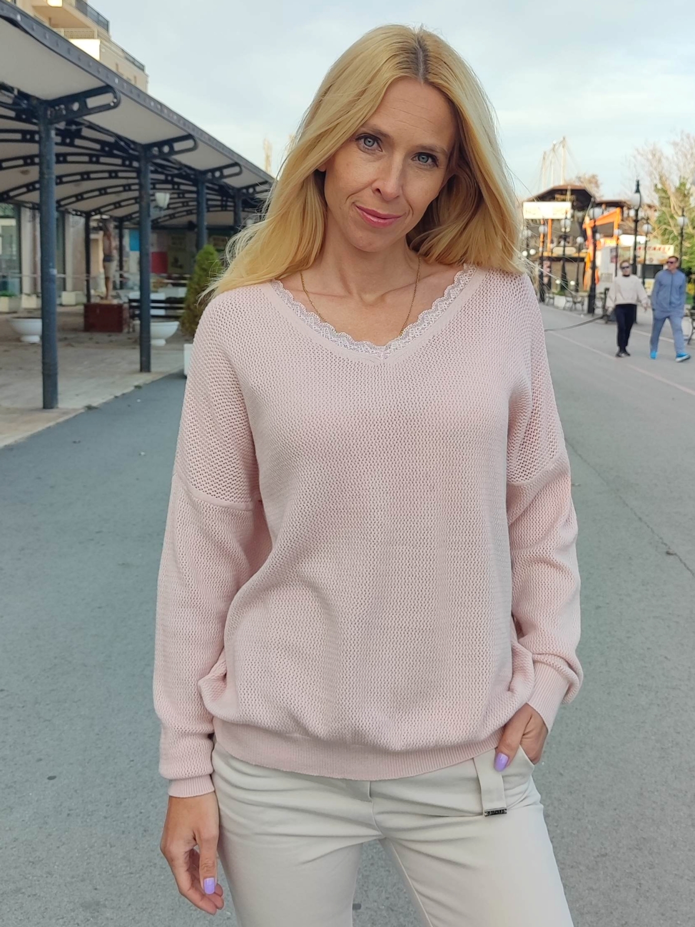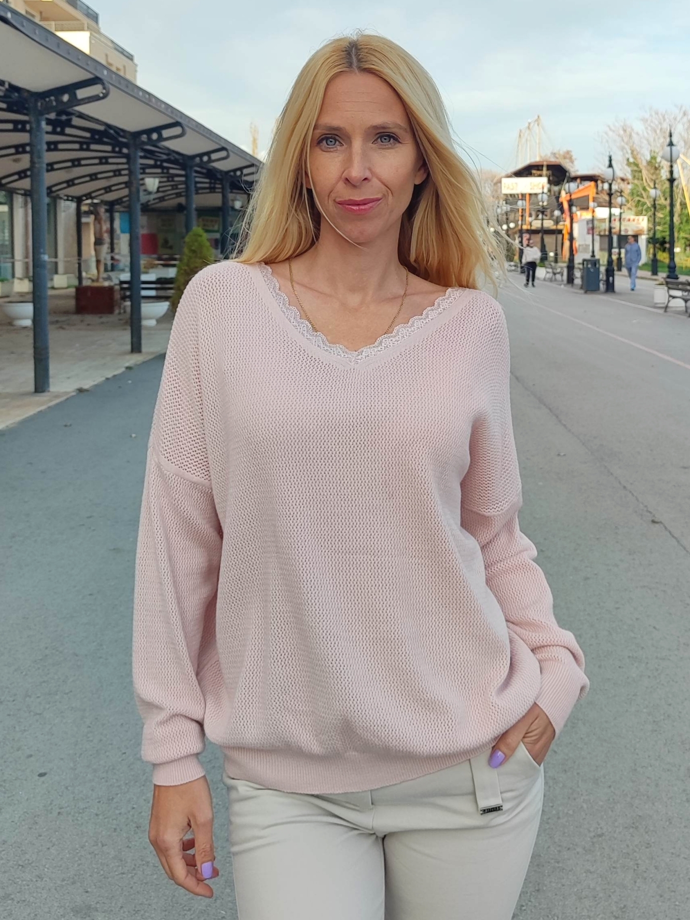 Елегантен пуловер в розово с V-образно деколте с дантела