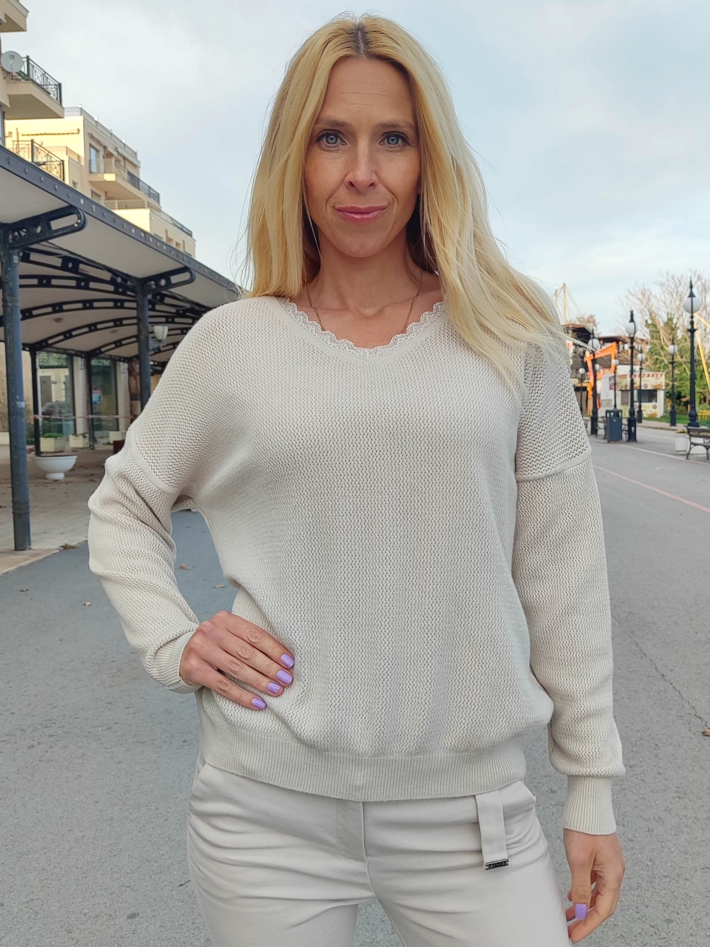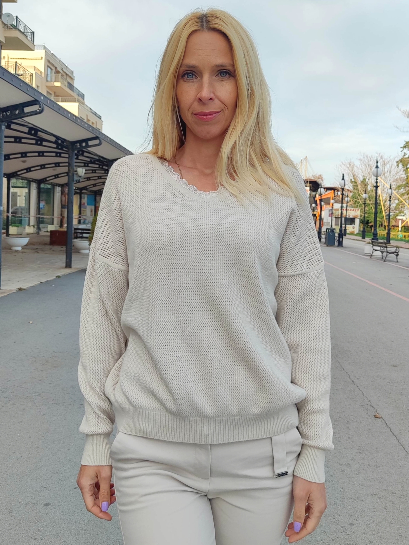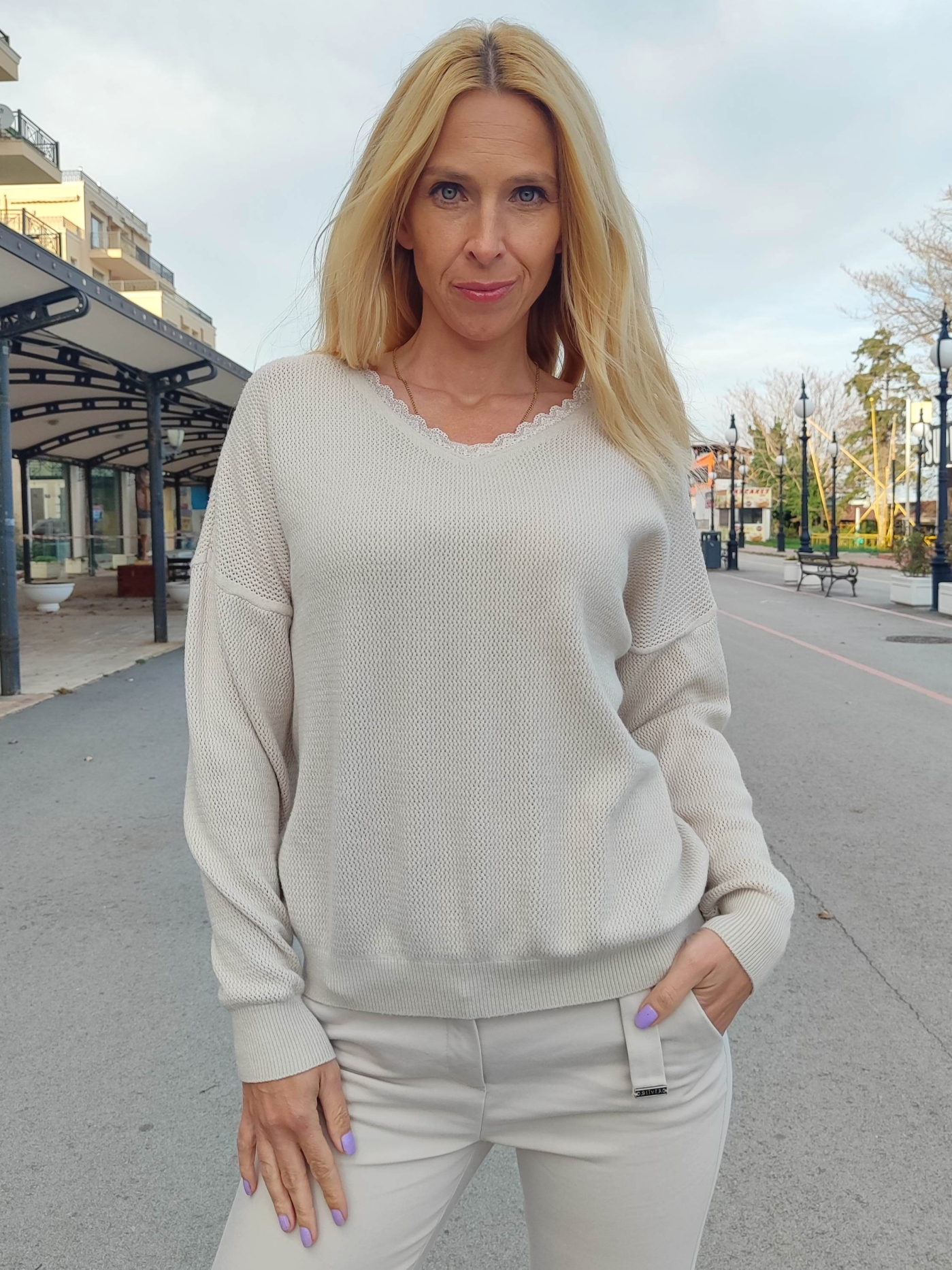 Елегантен пуловер в бежово с V-образно деколте с дантела