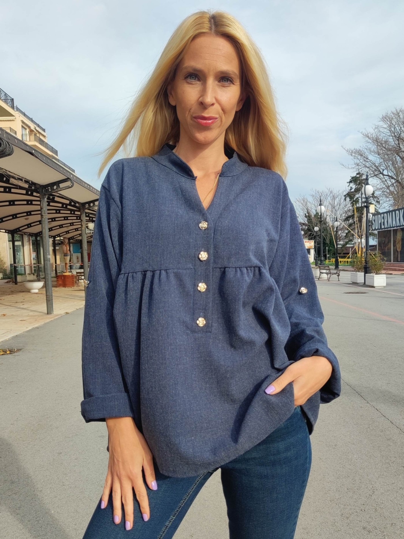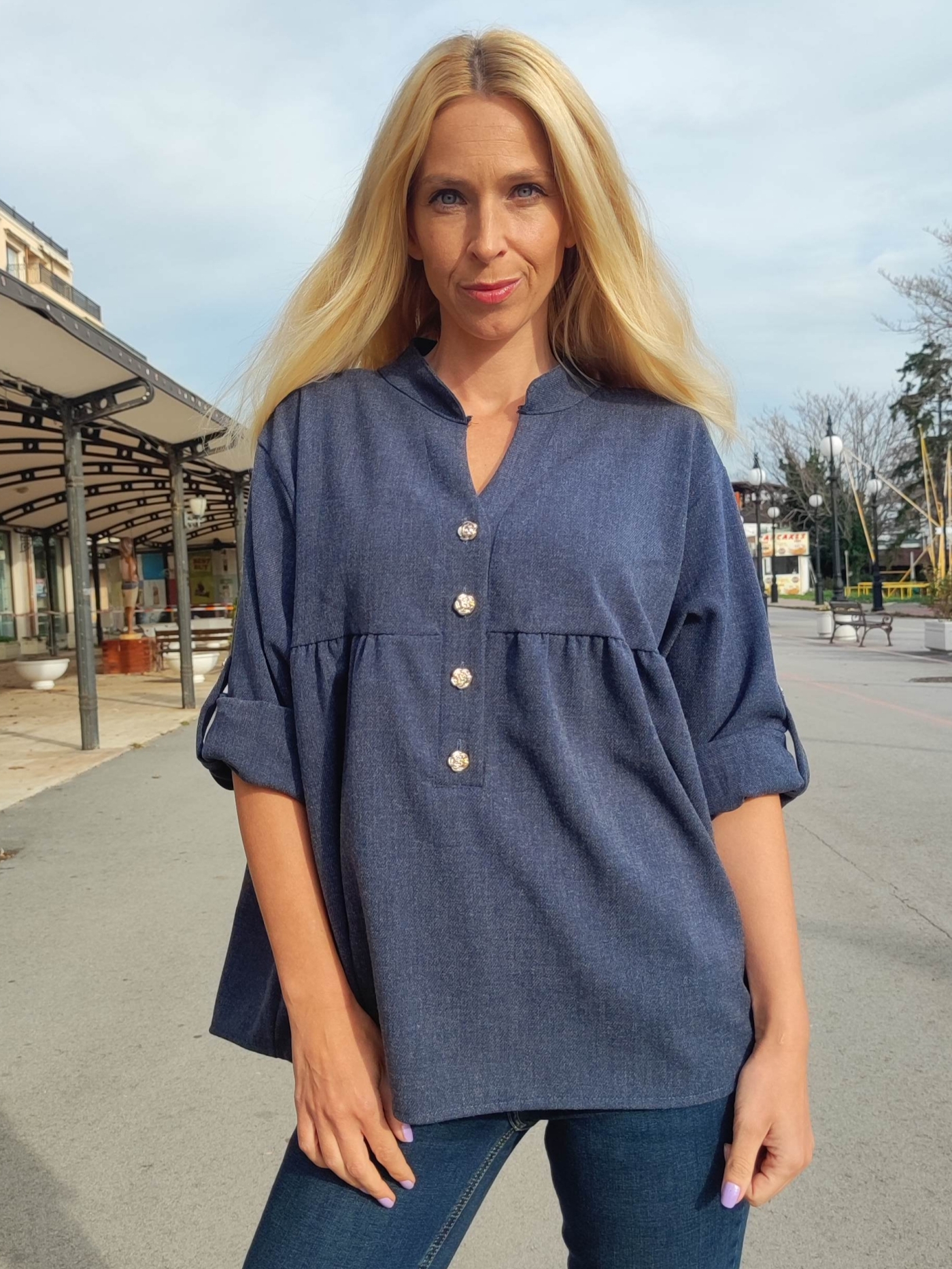 Тази дамска деним риза-блуза със свободна кройка съчетава комфорт и стил в едно. Изработена от лека и приятна материя, тя е идеална за ежедневието, работа или разходка. Моделът е с 4 декоративни копчета отпред, подгънати ръкави и модерна А-линия, която стои добре на всяка фигура. Блузата лесно се комбинира с дънки, панталон или пола, което я прави универсален избор за всякакви поводи. Перфектна за дамите, които търсят удобство и елегантен ежедневен стил.
