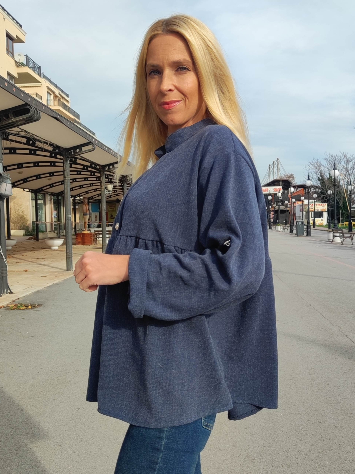 Дамска блуза в синьо- свободна кройка и декоративни копчета
