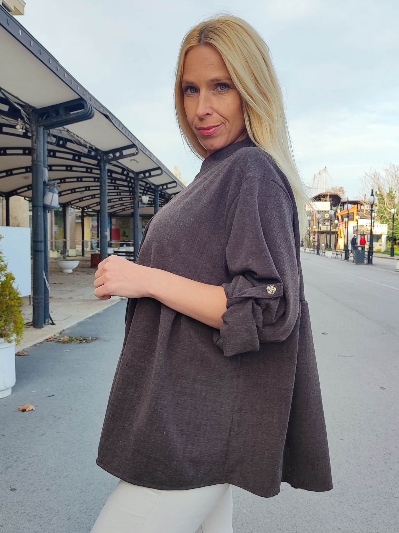 Тази дамска риза-блуза в кафяво със свободна кройка съчетава комфорт и стил в едно. Изработена от лека и приятна материя, тя е идеална за ежедневието, работа или разходка. Моделът е с 4 декоративни копчета отпред, подгънати ръкави и модерна А-линия, която стои добре на всяка фигура. Блузата лесно се комбинира с дънки, панталон или пола, което я прави универсален избор за всякакви поводи. Перфектна за дамите, които търсят удобство и елегантен ежедневен стил.