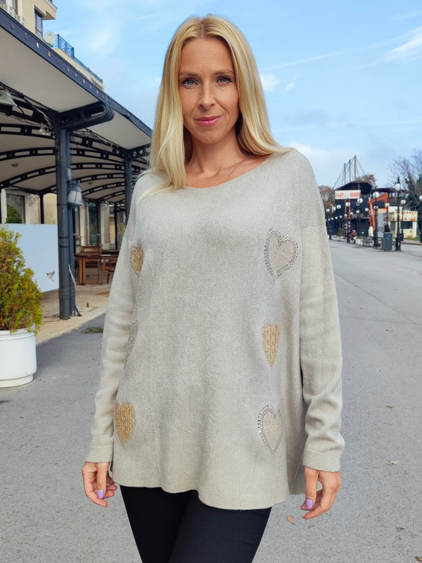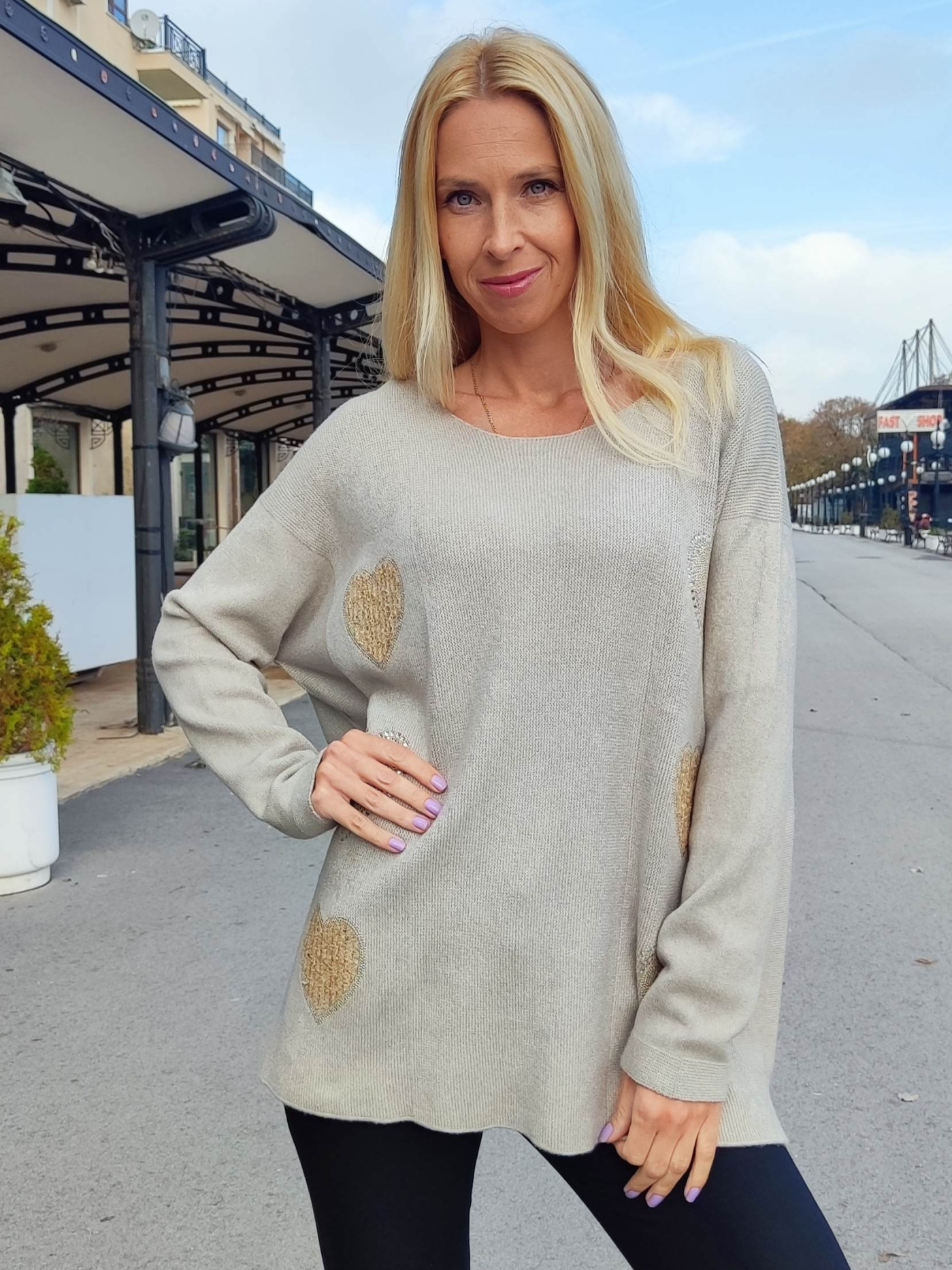 Украсена е с нежни апликации във формата на сърца, които придават женствен и елегантен завършек. Перфектен избор за ежедневието, разходки или небрежно-елегантни визии.