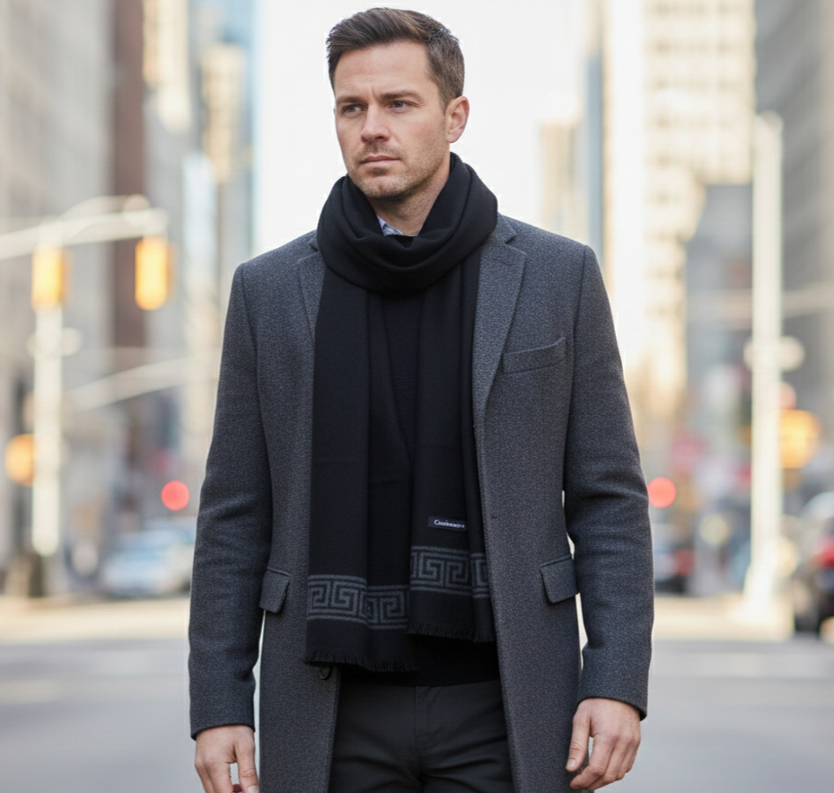 Луксозен мъжки кашмирен шал – изключително мек, топъл и елегантен аксесоар, подходящ за всеки стил и повод.