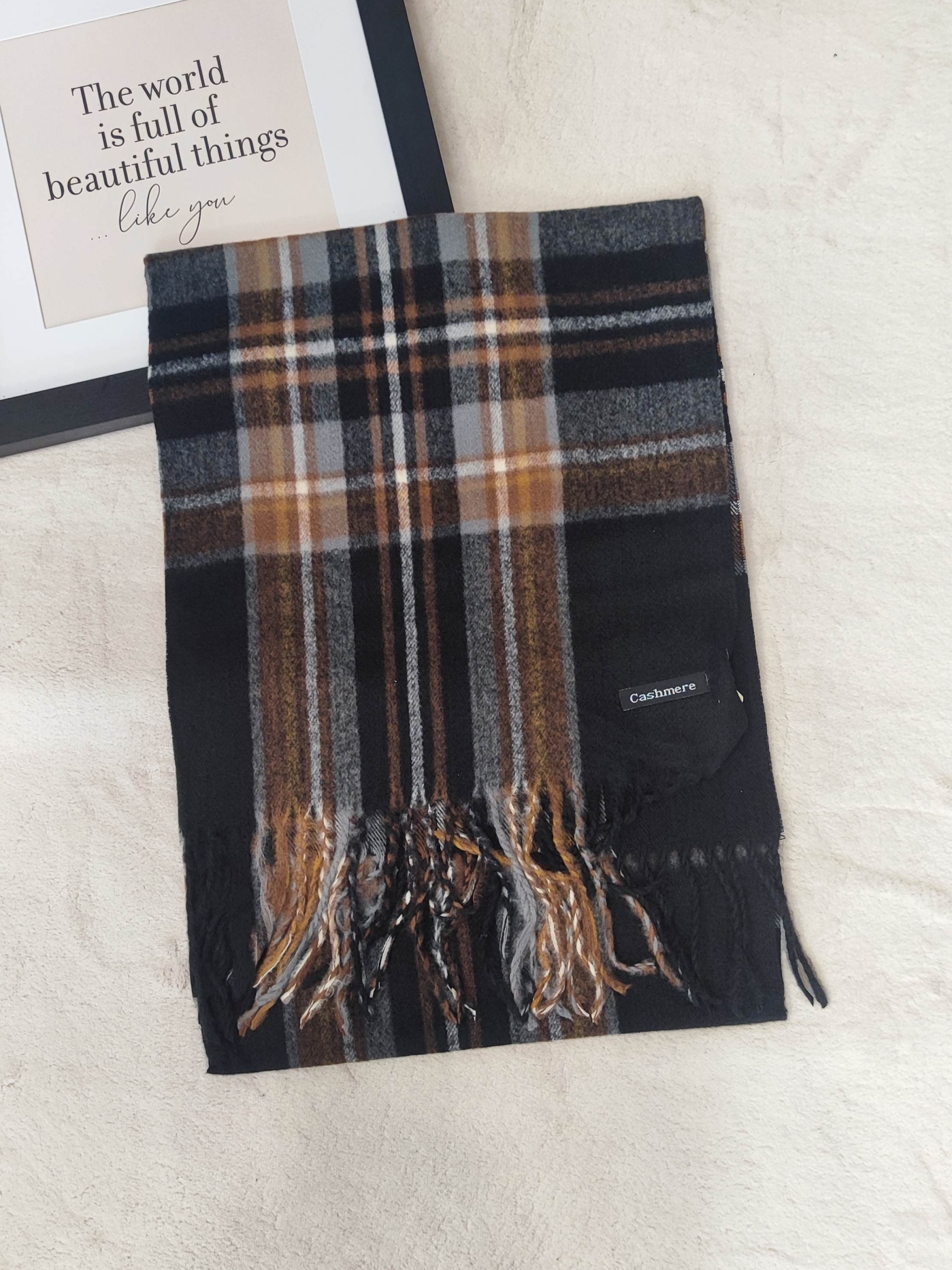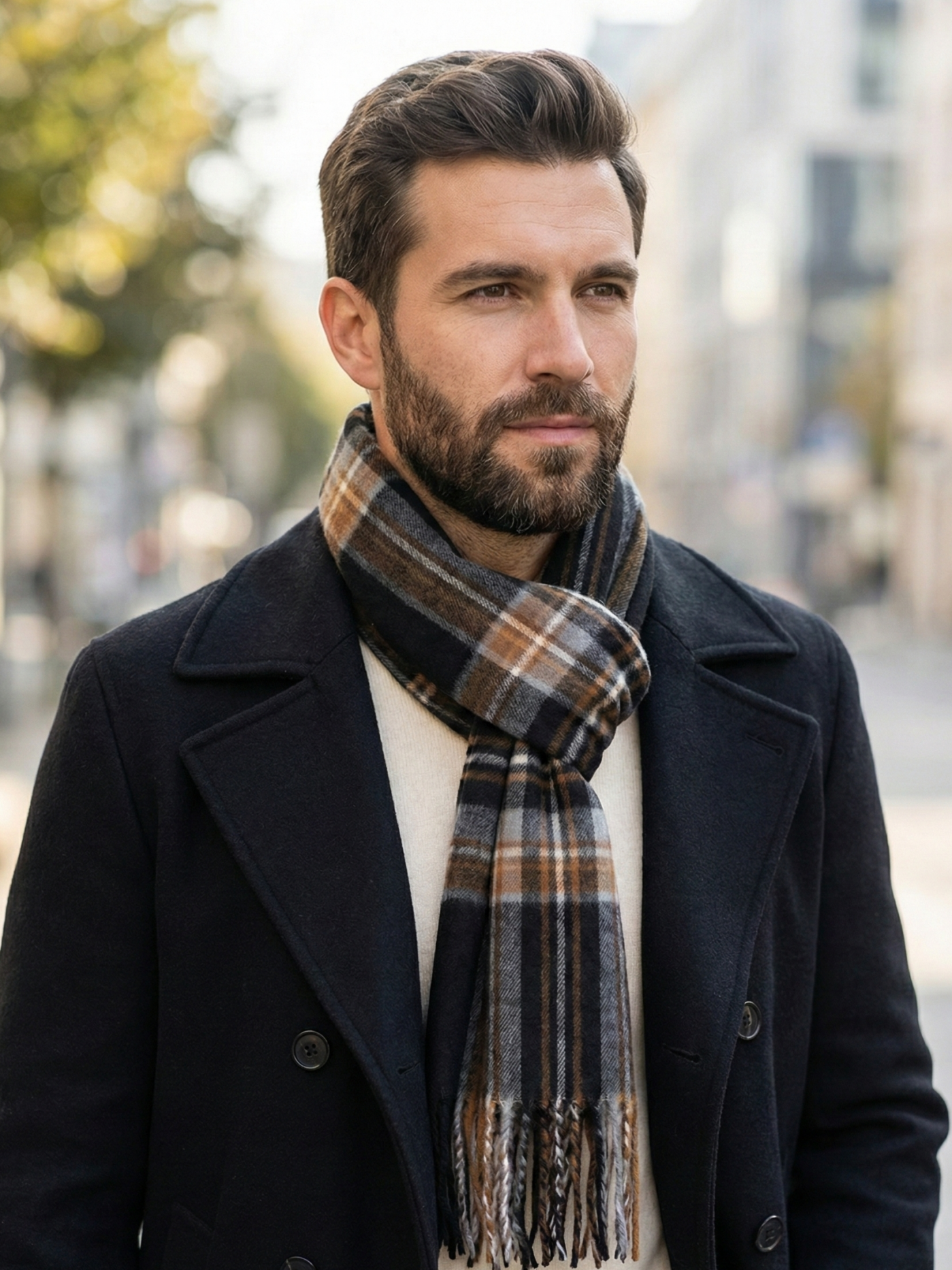 Универсална цветова палитра: Черно и кафяво. Тази комбинация го прави лесен за съчетаване както с тъмносиньо или черно палто, така и с кафяви кожени якета или бежови тренчкоти.