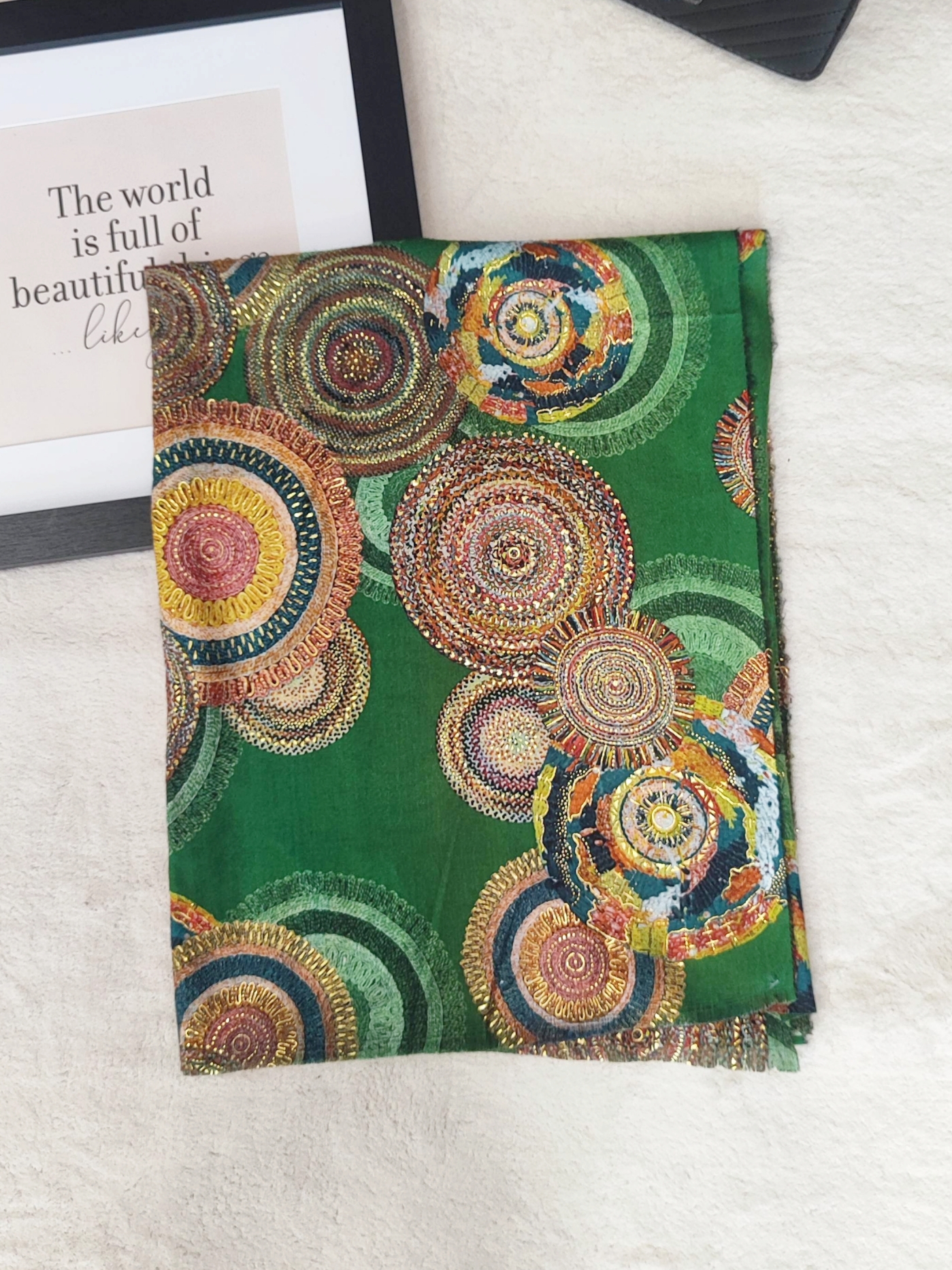 Преобразете ежедневието си с нашия изключителен дамски шал с арт мотиви. Този модел се отличава с богат, наситен цвят зелен и впечатляващ дизайн от преплетени цветни кръгове и стилизирани кръгове. Детайлите, напомнящи фина бродерия и златисти акценти, придават усещане за лукс и класа.