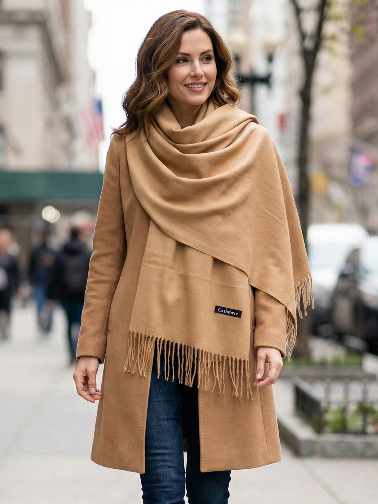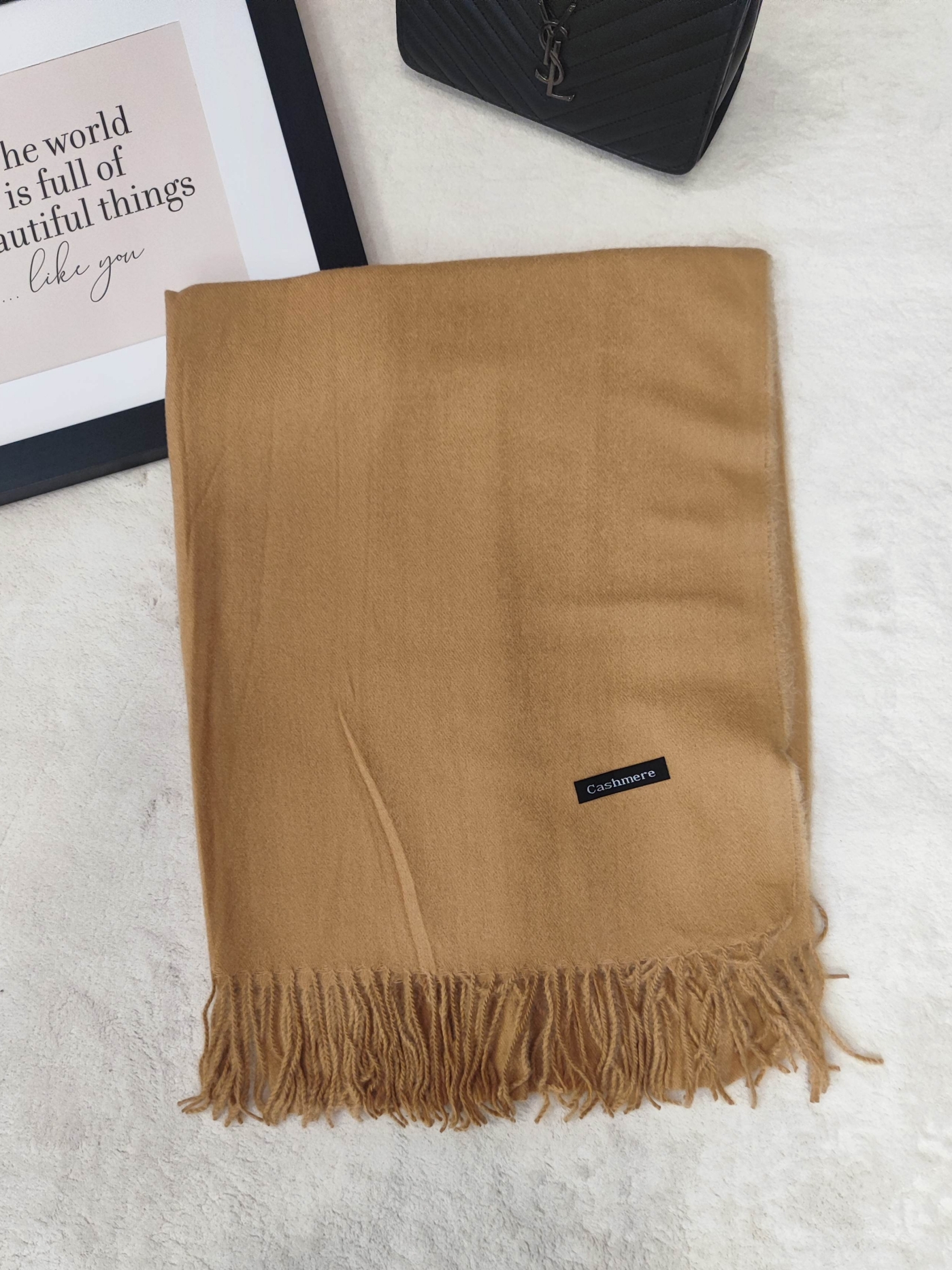 Луксозен, светло кафяв кашмирен шал. Осигурява несравнима топлина и мекота.