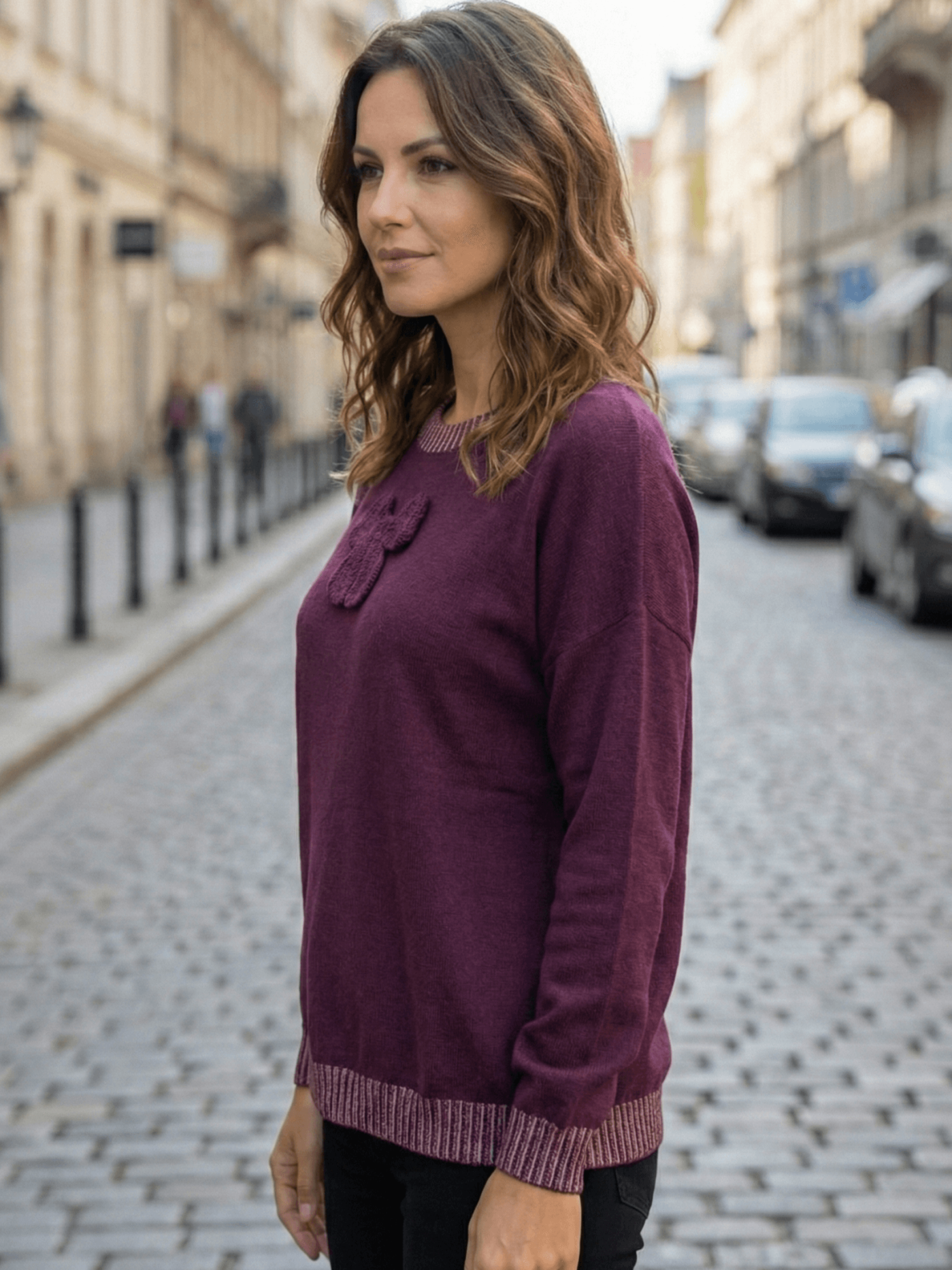 Тази блуза в бордо е изработена от висококачествена вискоза, която гали кожата и осигурява лекота през целия ден. Акцентът пада върху красивата плетена панделка на гърдите и дискретните ивици с вплетени златни нишки, които придават модерен и изискан блясък.