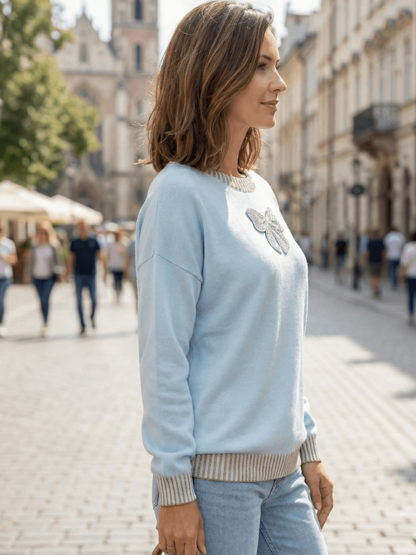 Тази светло синя блуза е изработена от висококачествена вискоза, която гали кожата и осигурява лекота през целия ден. Акцентът пада върху красивата плетена панделка на гърдите и дискретните ивици с вплетени златни нишки, които придават модерен и изискан блясък.