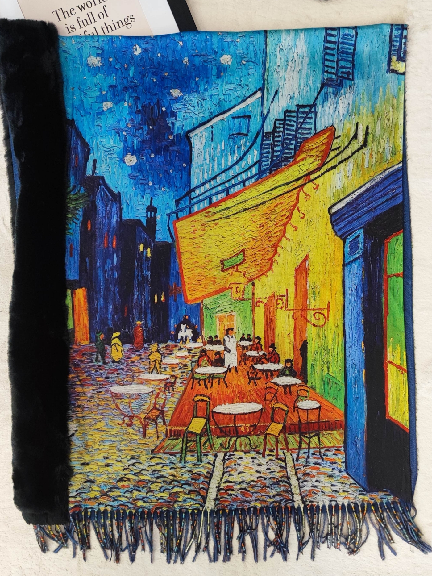 Този шал не е просто аксесоар, а покана за разходка под звездното небе на Арл, Франция, пресъздадено от гениалния Винсент ван Гог. Вдъхновен от емблематичната картина „Нощно кафе тераса“, този модел е създаден за жената с отношение към изкуството и елегантния стил.