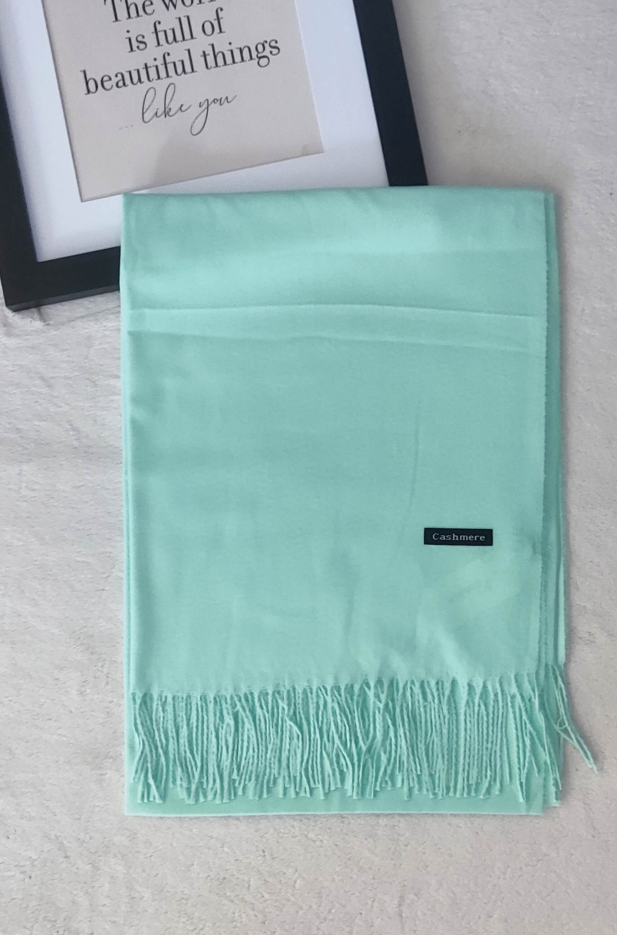 Луксозен, кашмирен шал в цвят мента. Осигурява несравнима топлина и мекота.