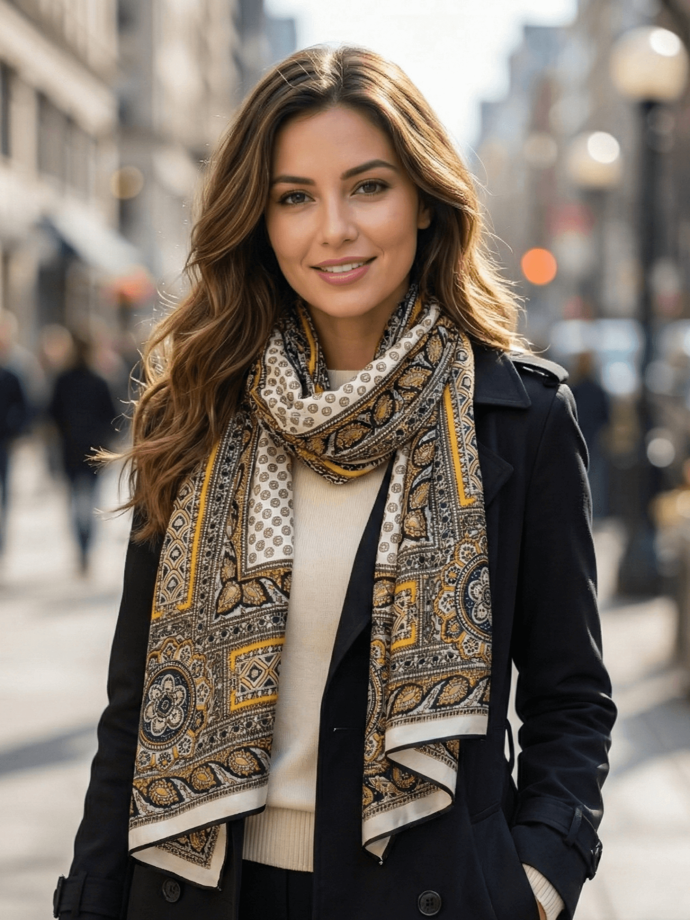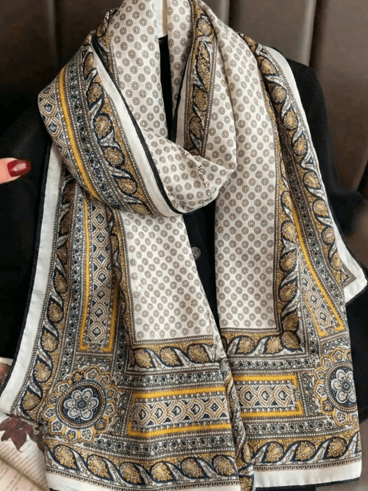 Дизайнът съчетава класическа основа в цвят екрю с богати орнаменти в златиста горчица и контрастни тъмни кантове, което го прави лесен за съчетаване с палта, сака и рокли.