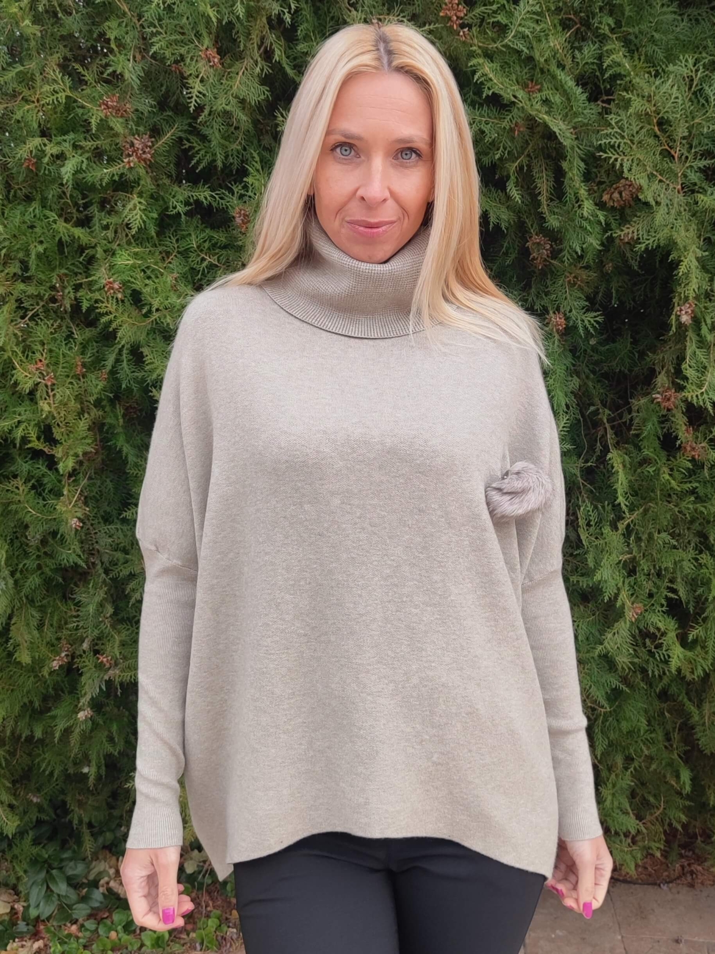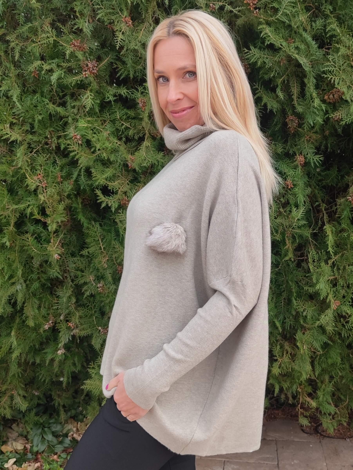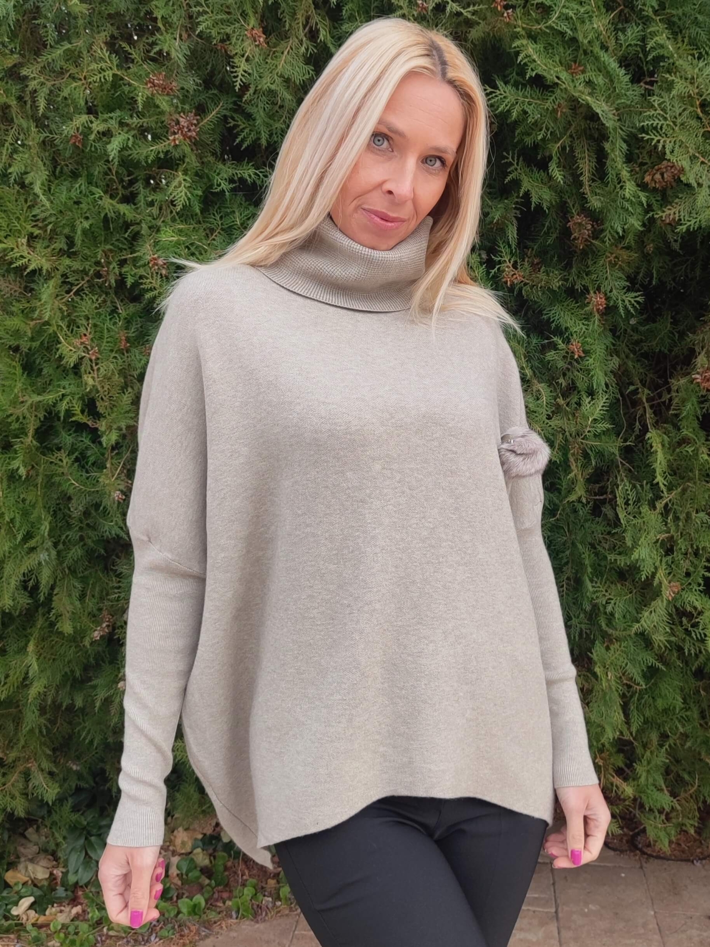 Дизайнът е със стилна висока поло яка и ефектен декоративен елемент (пухче) отстрани, който придава уникалност на визията. Свободната кройка тип "oversize" го прави идеален избор за дами, които предпочитат свободата на движение.