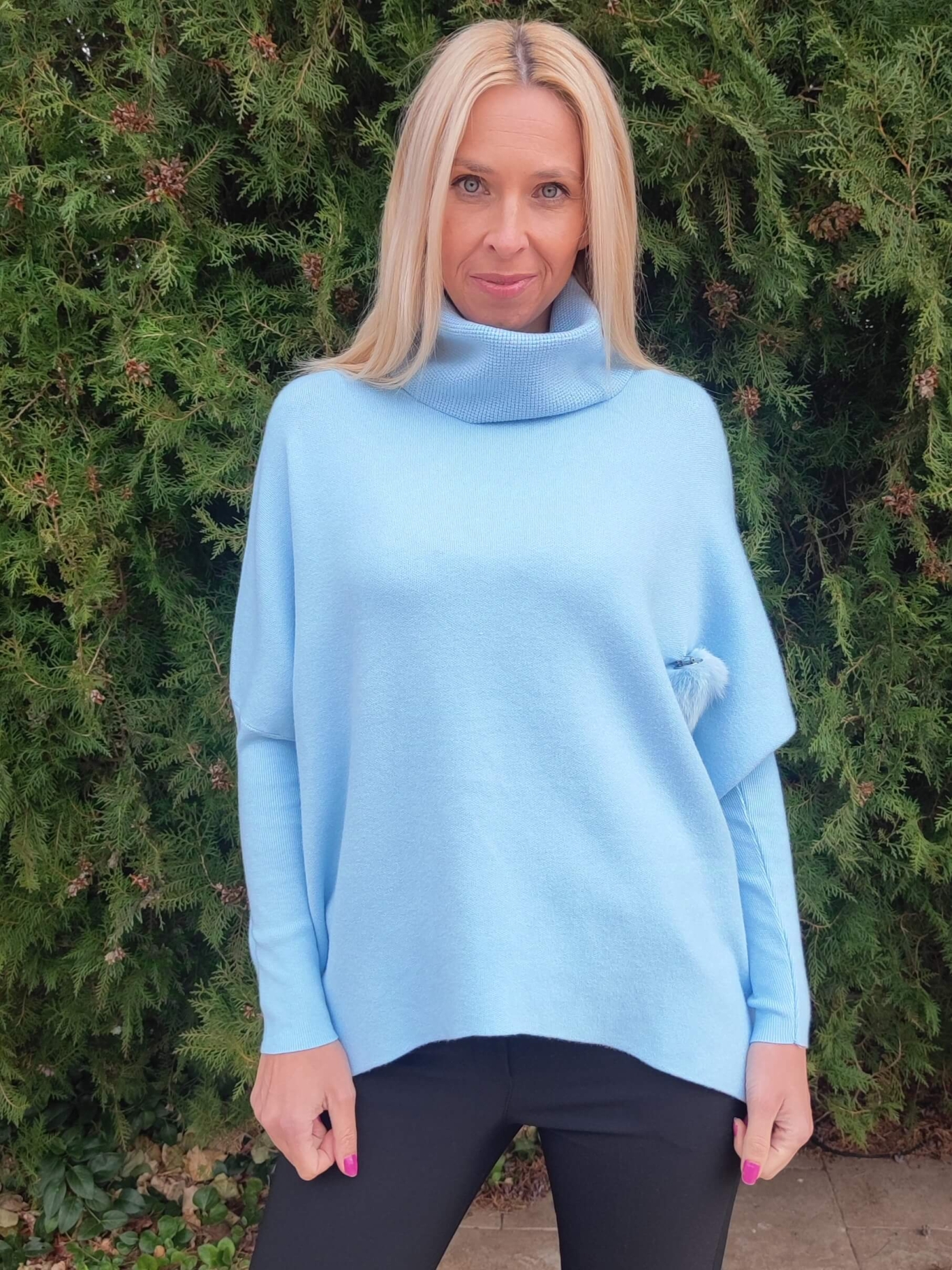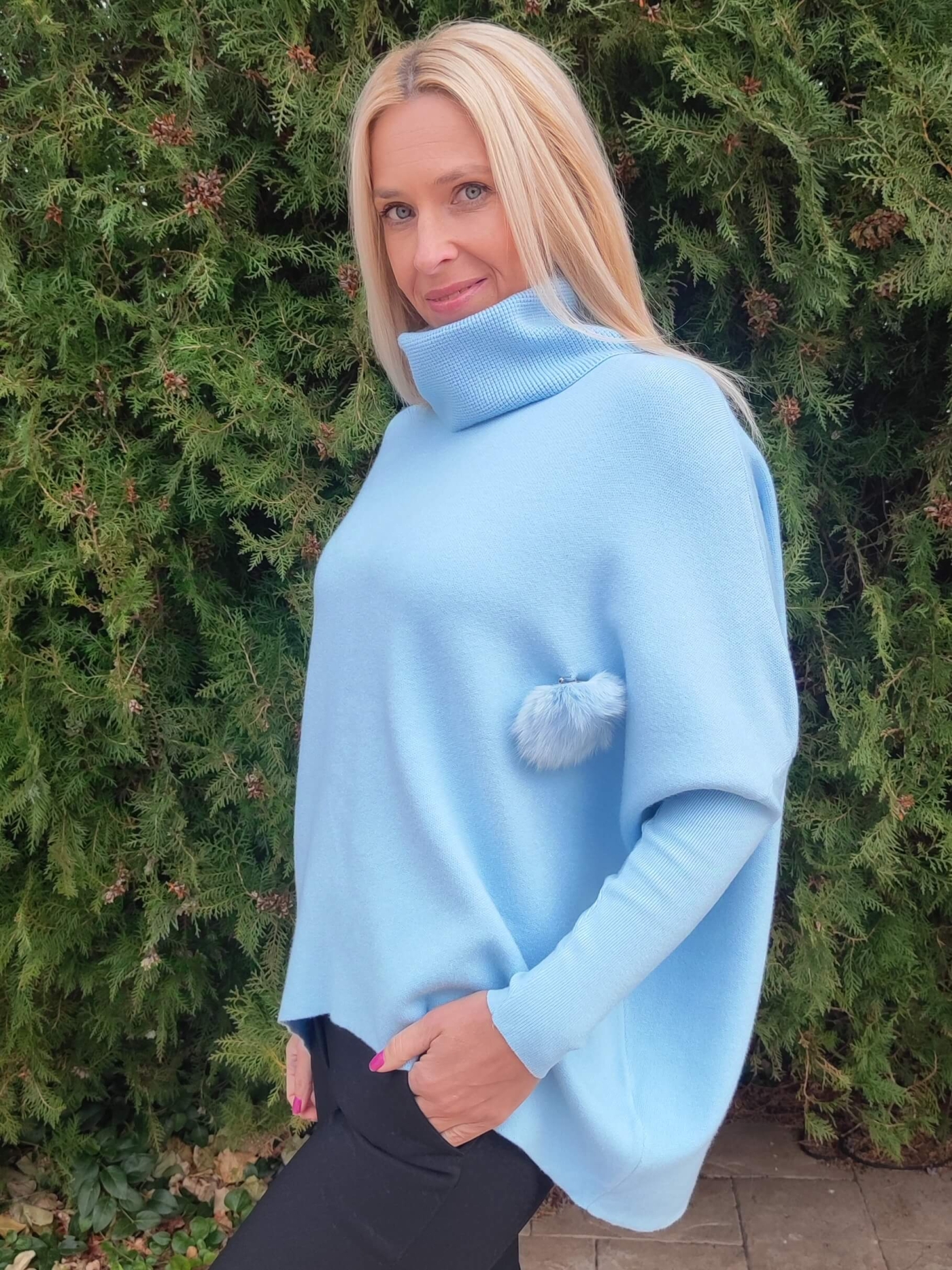 Открийте този мек дамски пуловер в светло синьо с поло яка.