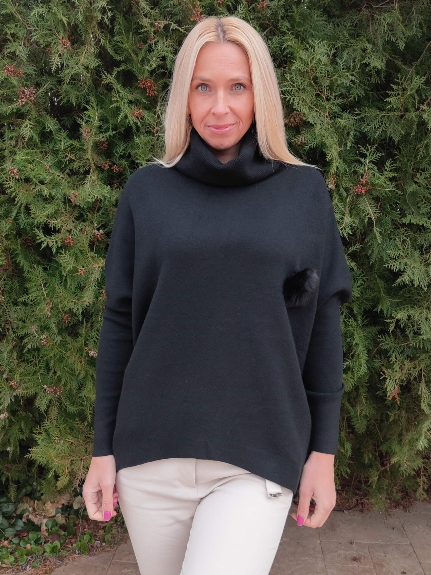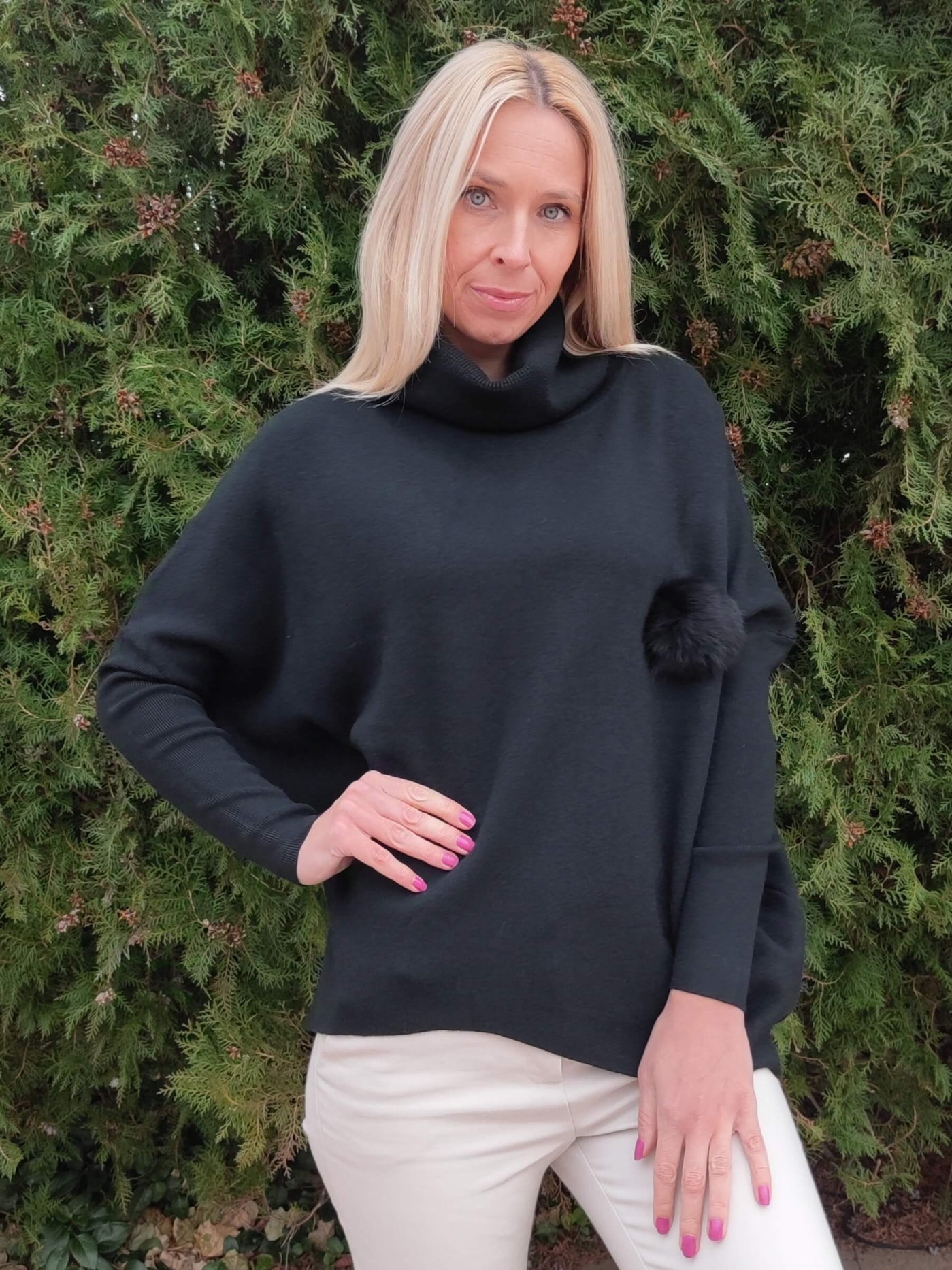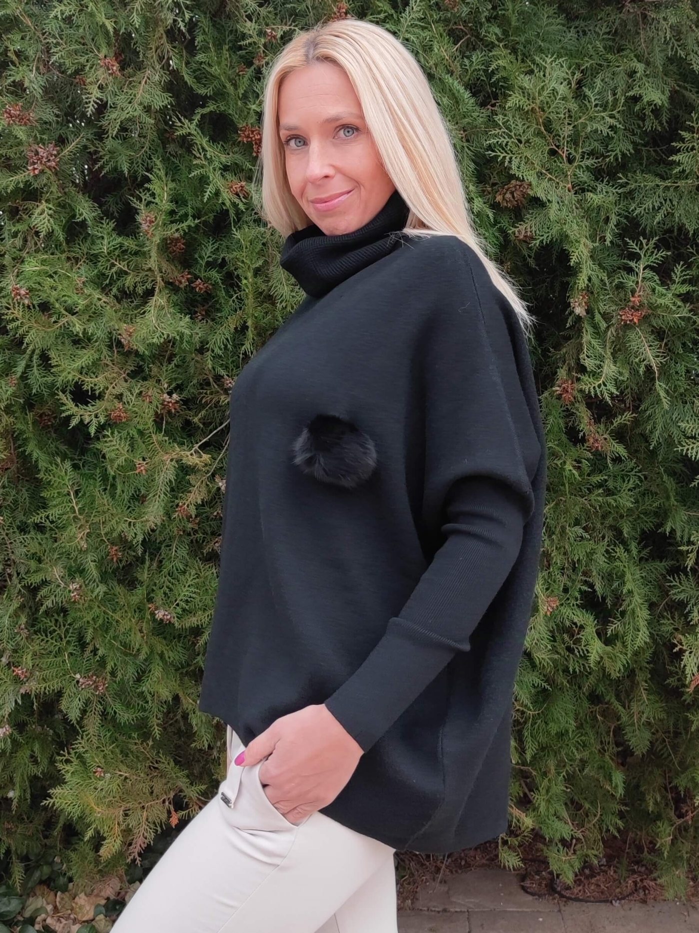 Дизайнът е със стилна висока поло яка и ефектен декоративен елемент (пухче) отстрани, който придава уникалност на визията. Свободната кройка тип "oversize" го прави идеален избор за дами, които предпочитат свободата на движение.