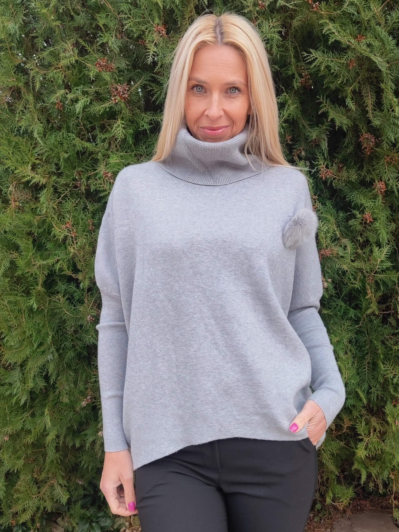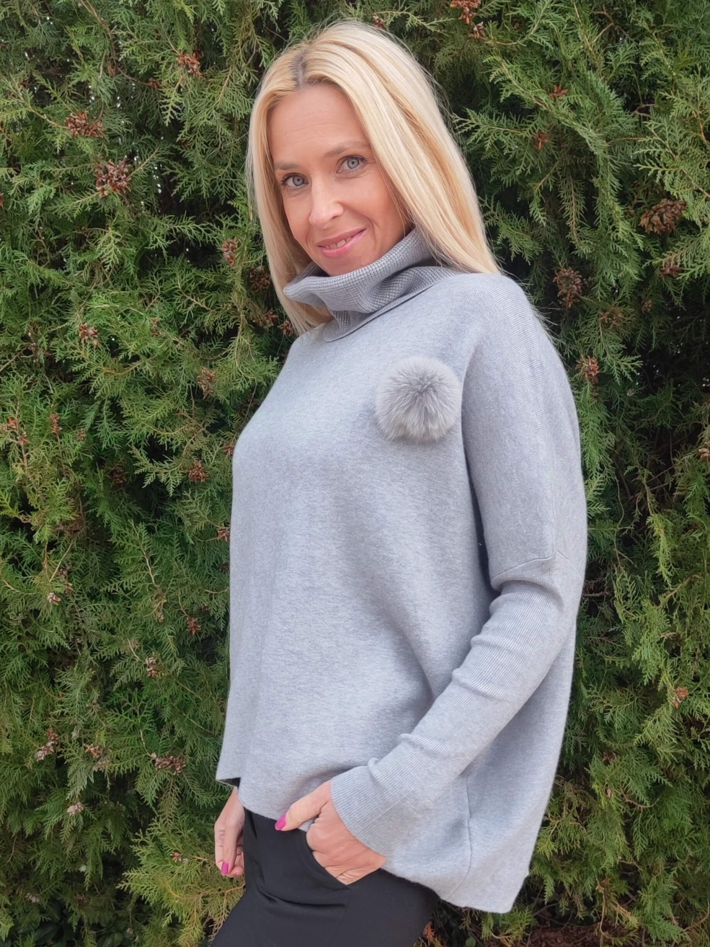 Дизайнът е със стилна висока поло яка и ефектен декоративен елемент (пухче) отстрани, който придава уникалност на визията. Свободната кройка тип "oversize" го прави идеален избор за дами, които предпочитат свободата на движение.