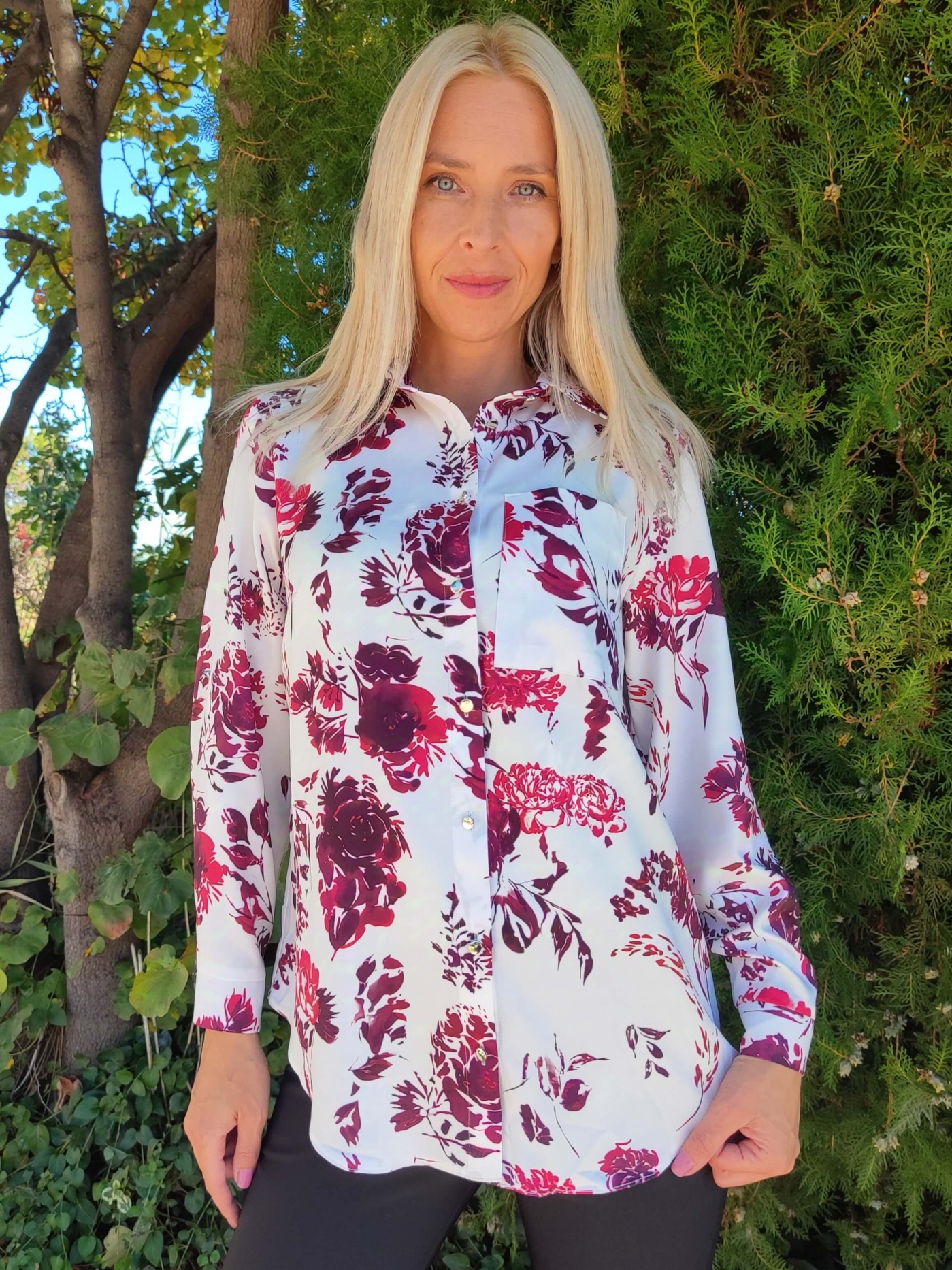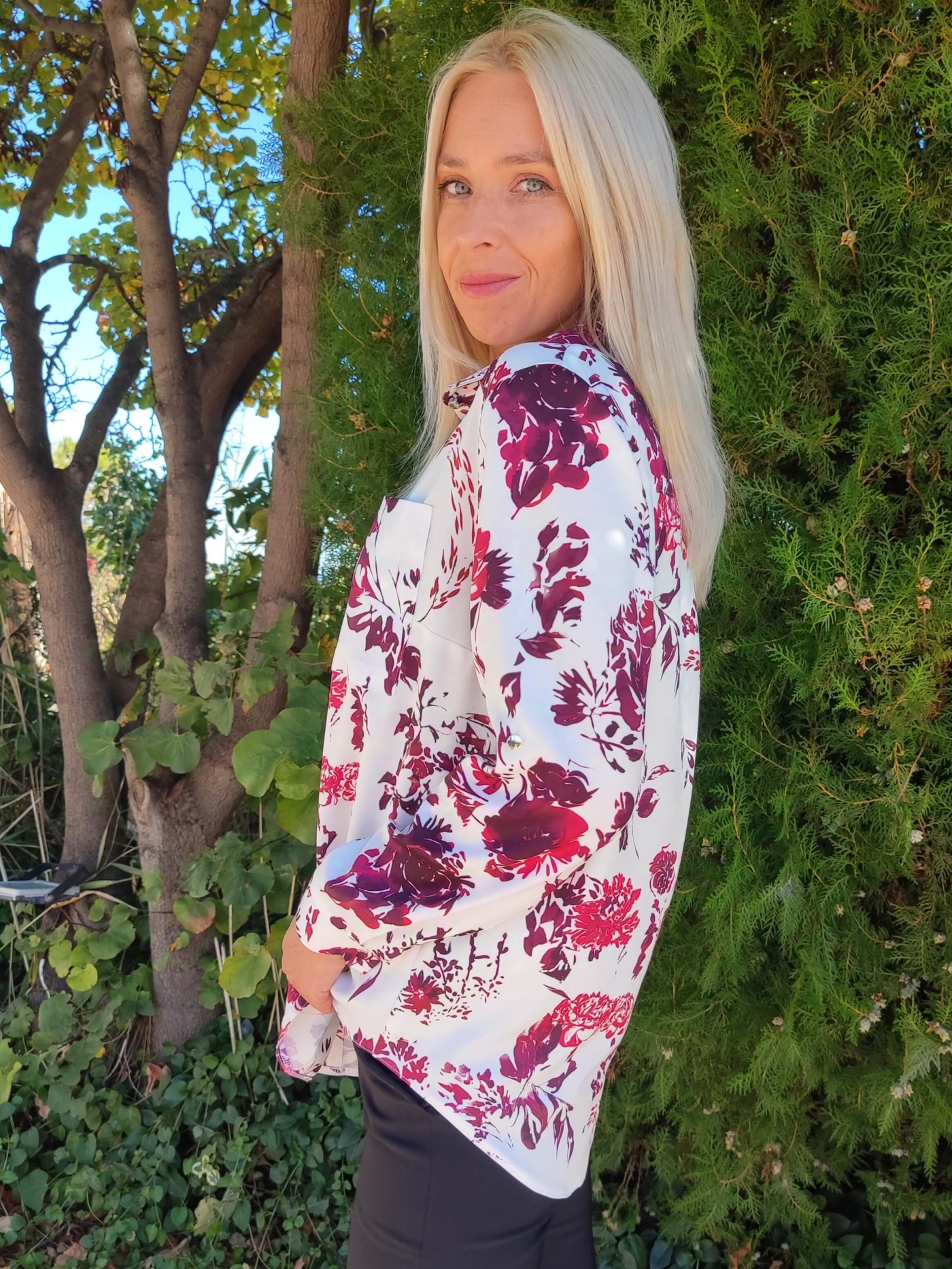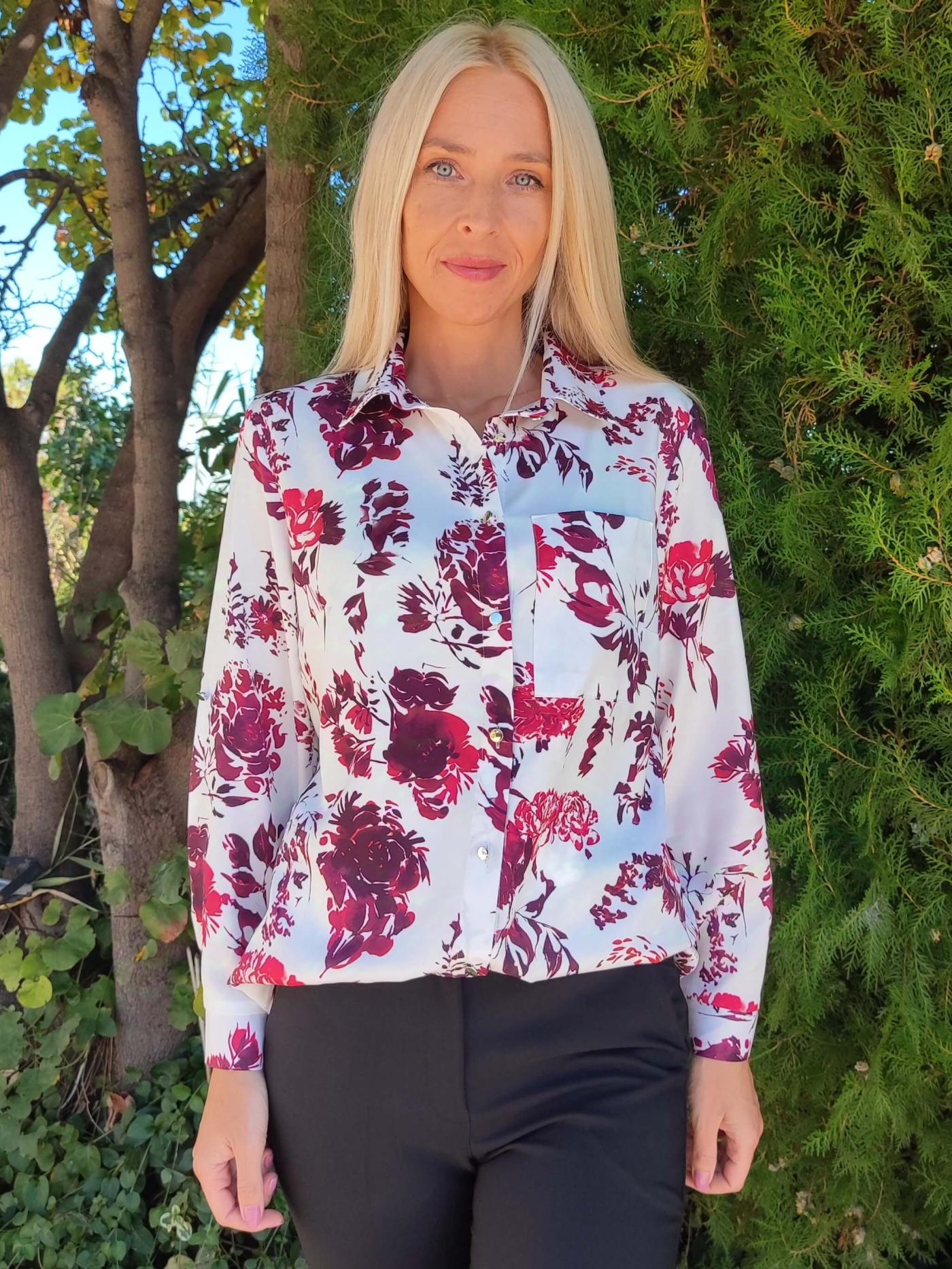 Внесете настроение в гардероба си с нашата бяла дамска риза, акцентирана с изящни флорални мотиви в наситено бордо и червено. Този модел е идеалното решение за дамите, които търсят баланс между елегантна офис визия и свободата на ежедневното облекло.