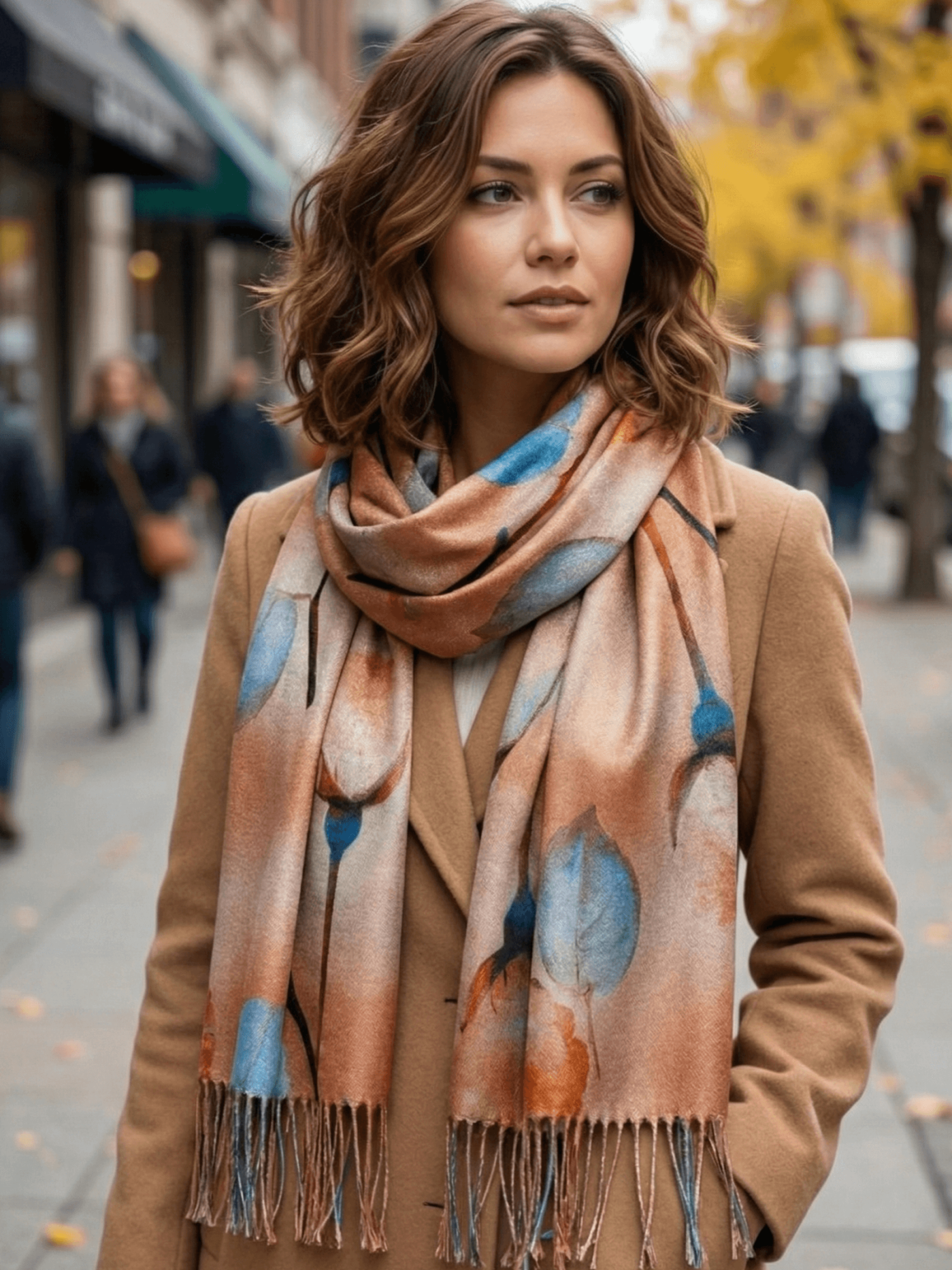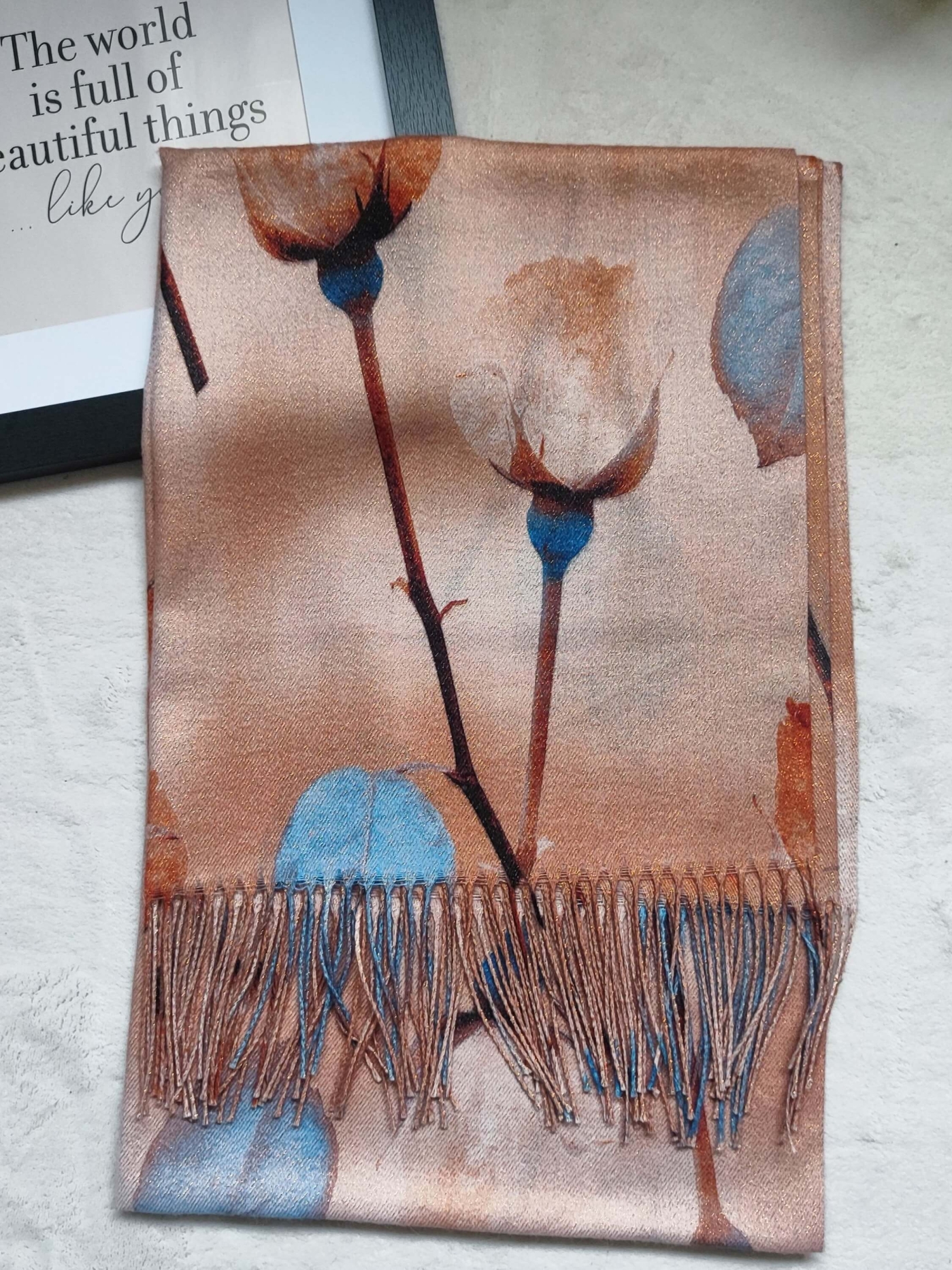 Уникален акварелен дизайн в бронзови и сини тонове, завършен с елегантни ресни.