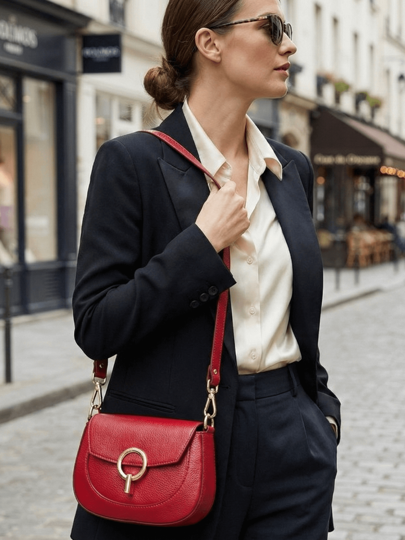 Със своя компактен размер и изчистен дизайн, чантата е идеална както за ежедневието, така и за специални поводи. Акцентът пада върху стилната кръгла катарама в златисто, която придава завършен и луксозен вид. Можете да я носите в ръка, на рамо или като кросова чанта (crossbody), благодарение на включената допълнителна дълга дръжка.