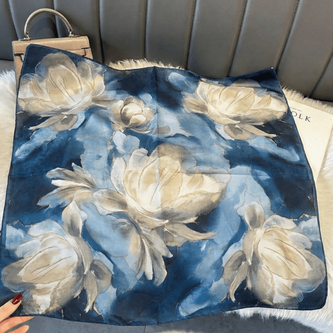 Изкуство върху плат: Дамски шал кърпа „Синя Магнолия“