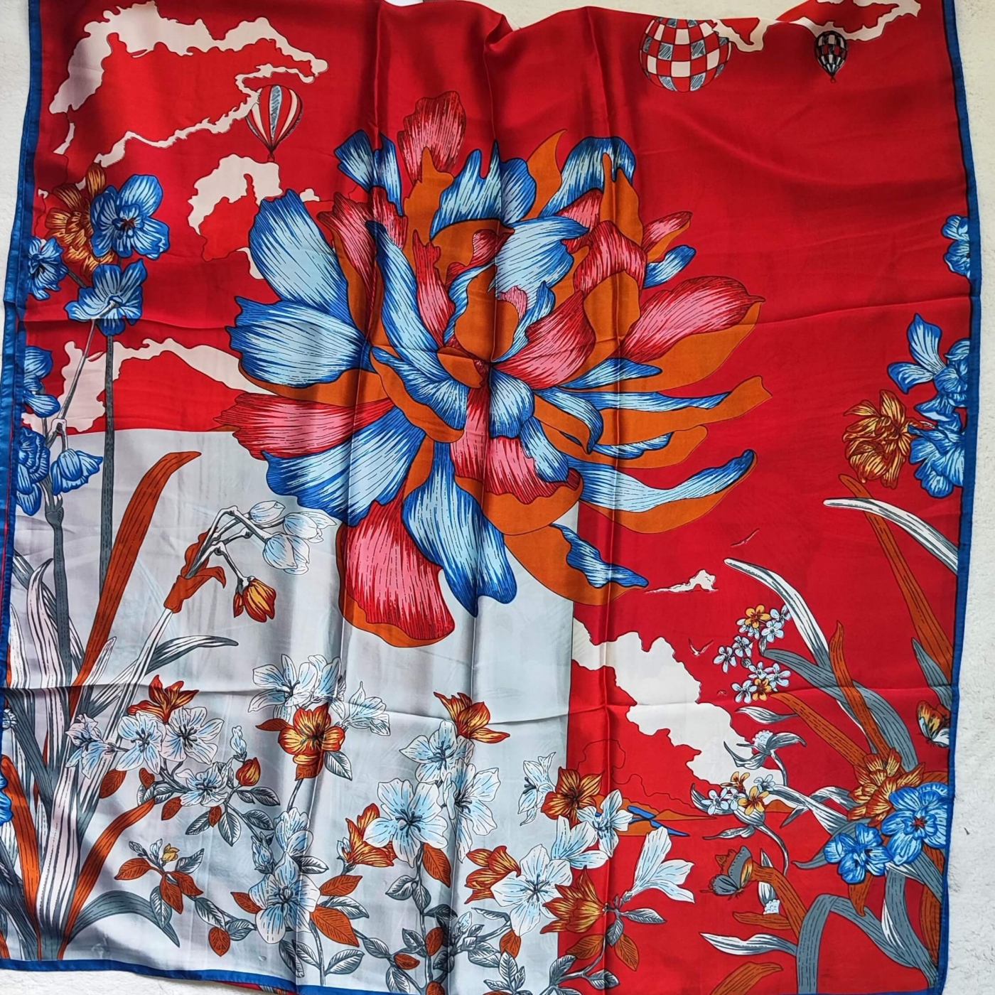 Луксозен сатенен шал с коприна и вискоза – Червена флорална фантазия (90х190 см)