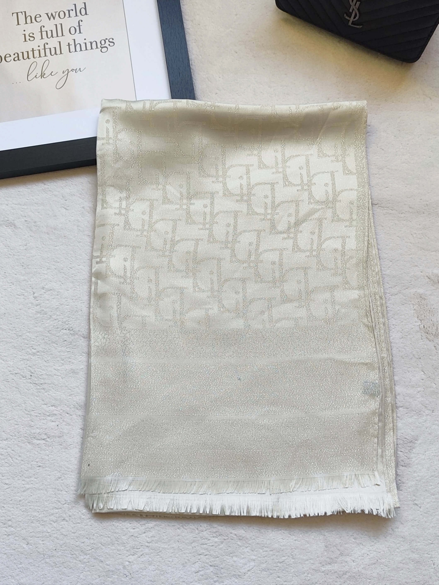 Дизайн Върху основата от светло злато се разгръщат елегантни фигурални мотиви с дискретен блясък. Размерът от 67/190 см ви дава свобода да го носите по десетки начини – като класически шал, като наметка върху вечерна рокля или небрежно преметнат за градски шик.