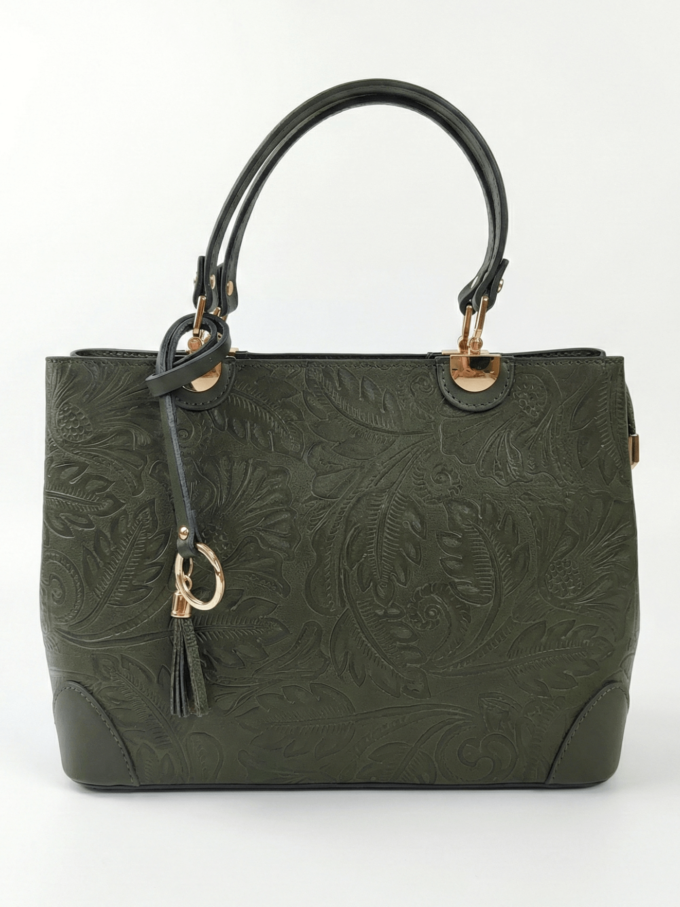 Италианска чанта от естествена кожа с флорален релеф - Тъмнозелена| Unique Fashion