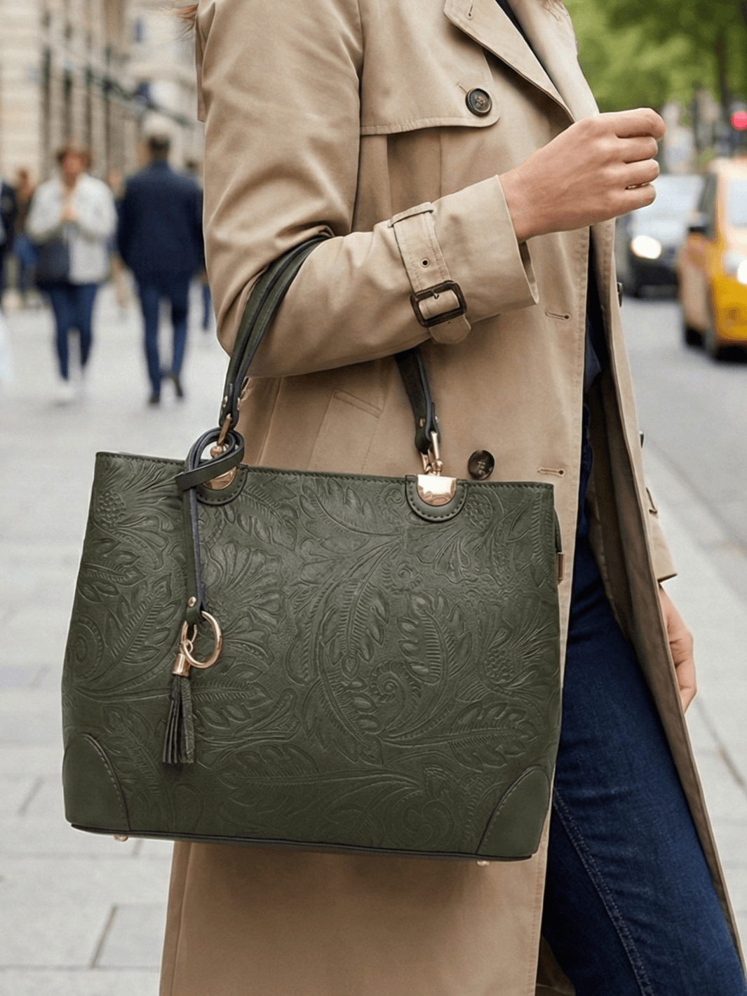Добавете нотка класа към визията си с тази изискана дамска чанта, изработена от висококачествена естествена кожа в сърцето на Италия – Флоренция. Моделът се отличава с уникална релефна текстура с флорални мотиви в наситен маслинено зелен цвят, който придава винтидж чар и индивидуалност.