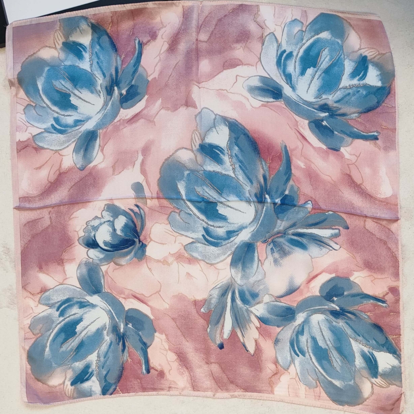 Дамски сатенен шал от Вискоза - Сини цветя на розов фон (70х70 см)