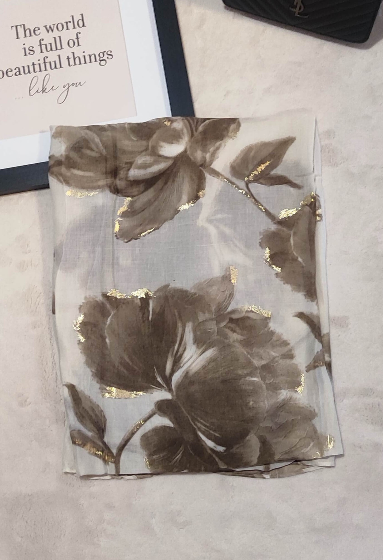 Внесете нотка изящество във визията си Този великолепен шал е перфектната комбинация между стил и комфорт. Изработен от висококачествена вискоза, той гали кожата с мекотата си и пада тежко и елегантно. Дизайнът се отличава с големи, живописни цветя в кафеви и бежови нюанси, подчертани с дискретни златисти контури, които придават луксозно излъчване.