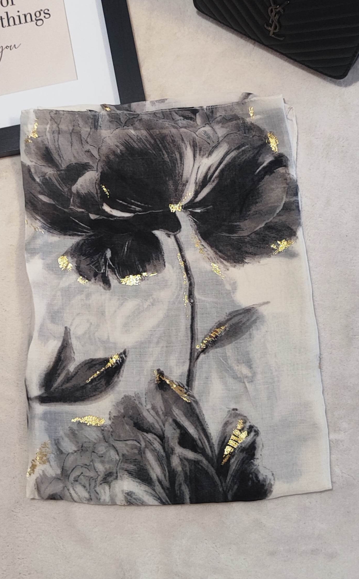 Класически контраст и стил: Бял дамски шал с ефектни черни цветя и фин златен блясък.