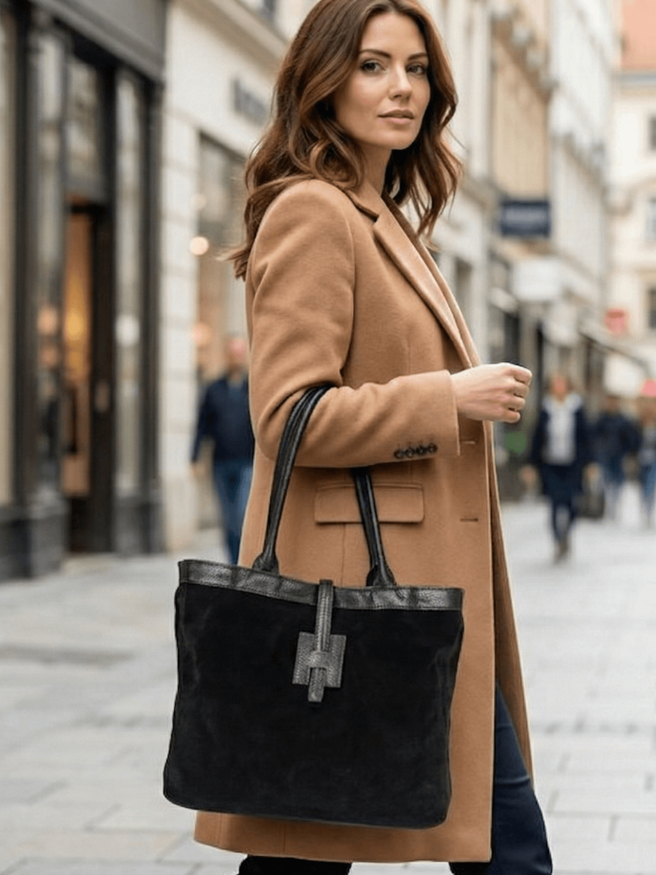 Тази чанта е създадена за динамичната съвременна жена, която не прави компромис между стил и функционалност. Дизайнът се отличава с комбинация от текстури – фин велур в основната част и здрави кожени елементи по ръбовете, дъното и дръжките за допълнителна устойчивост.