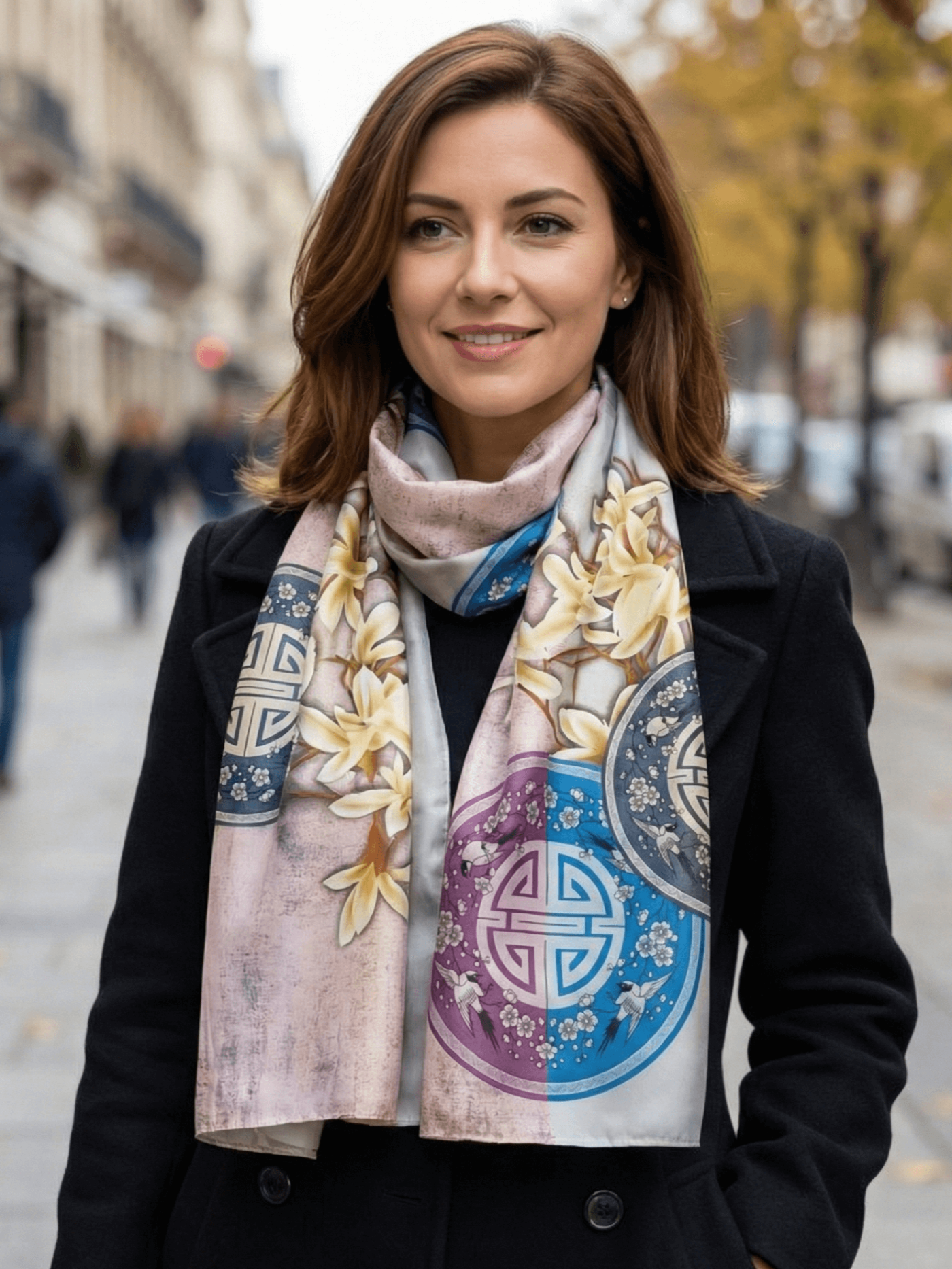 Дизайнът съчетава класическа елегантност с природна красота – едри кремави цветя и пойни птици са вплетени около стилизирани геометрични кръгове. Материята от 30% коприна и 70% вискоза осигурява нежен блясък и изключителен комфорт при допир с кожата.