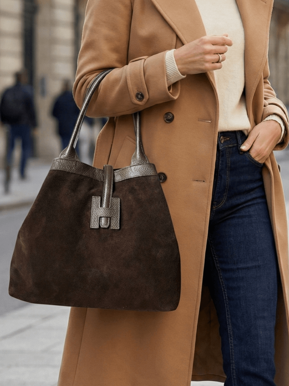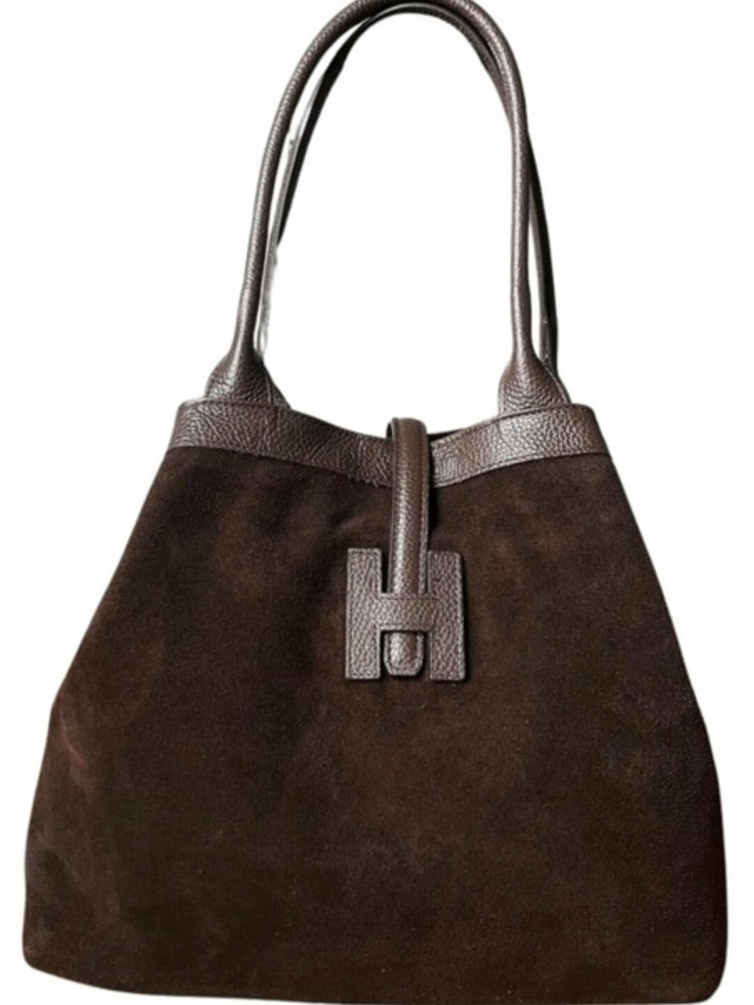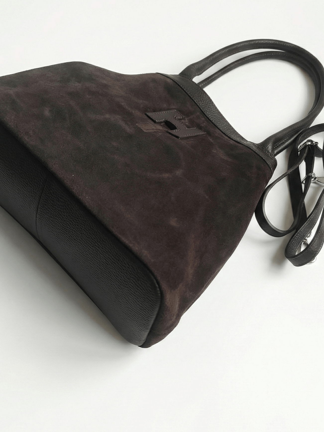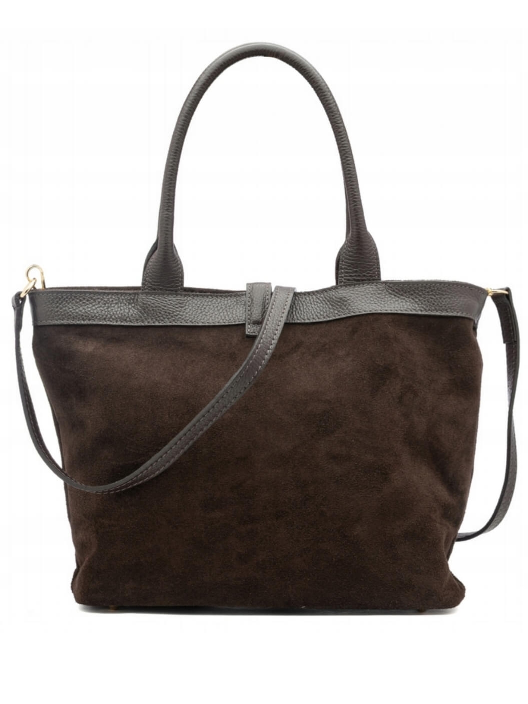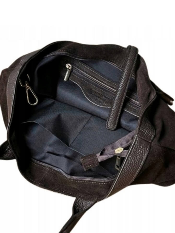 Италианска дамска чанта от естествен велур и кожа – Тъмно Кафяв класически модел с променяща се форма