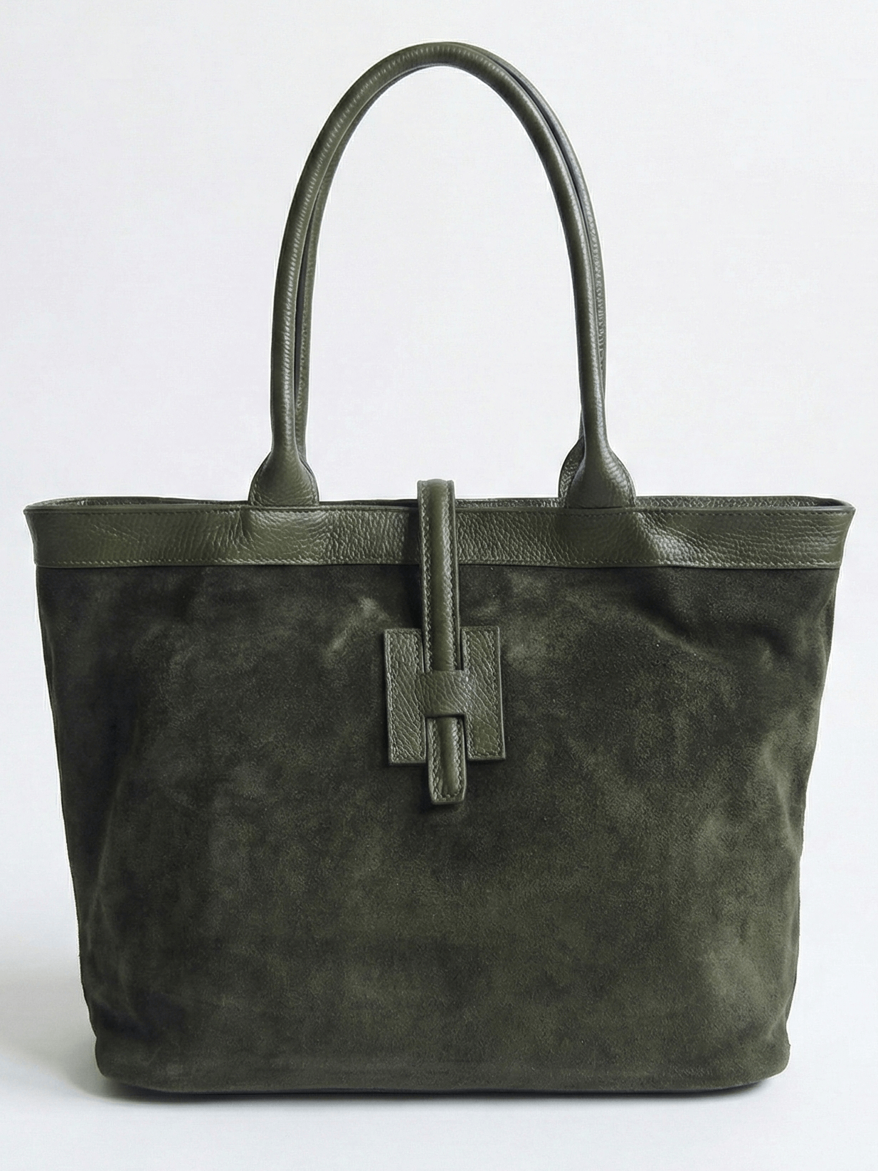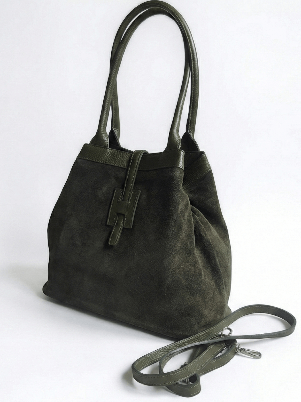 Италианска дамска чанта от естествен велур и кожа в Зелено (Хаки) класически модел с променяща се форма