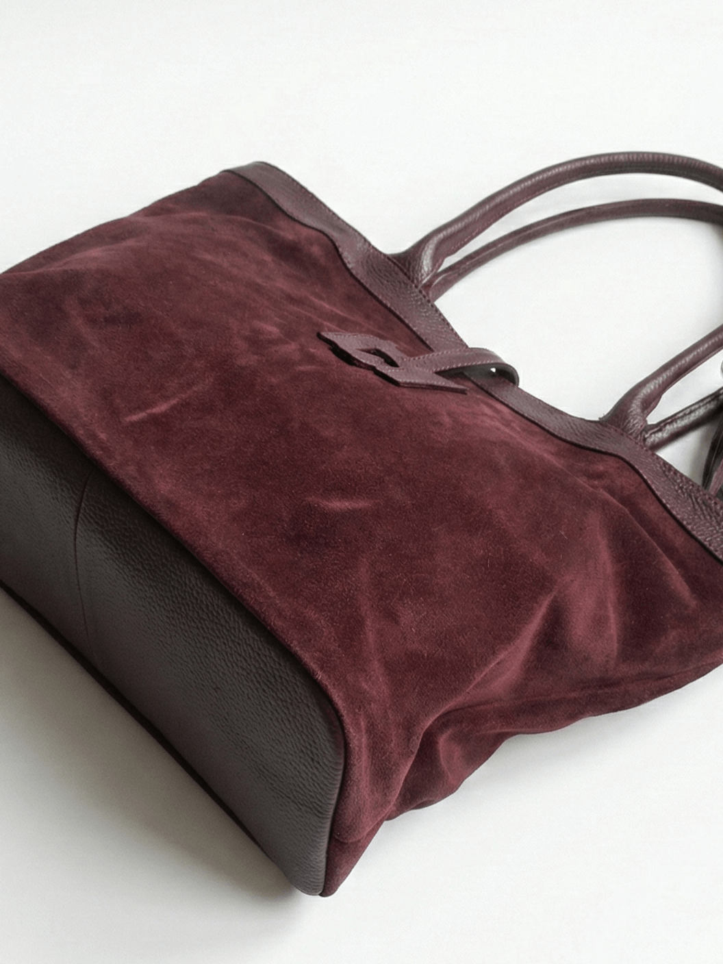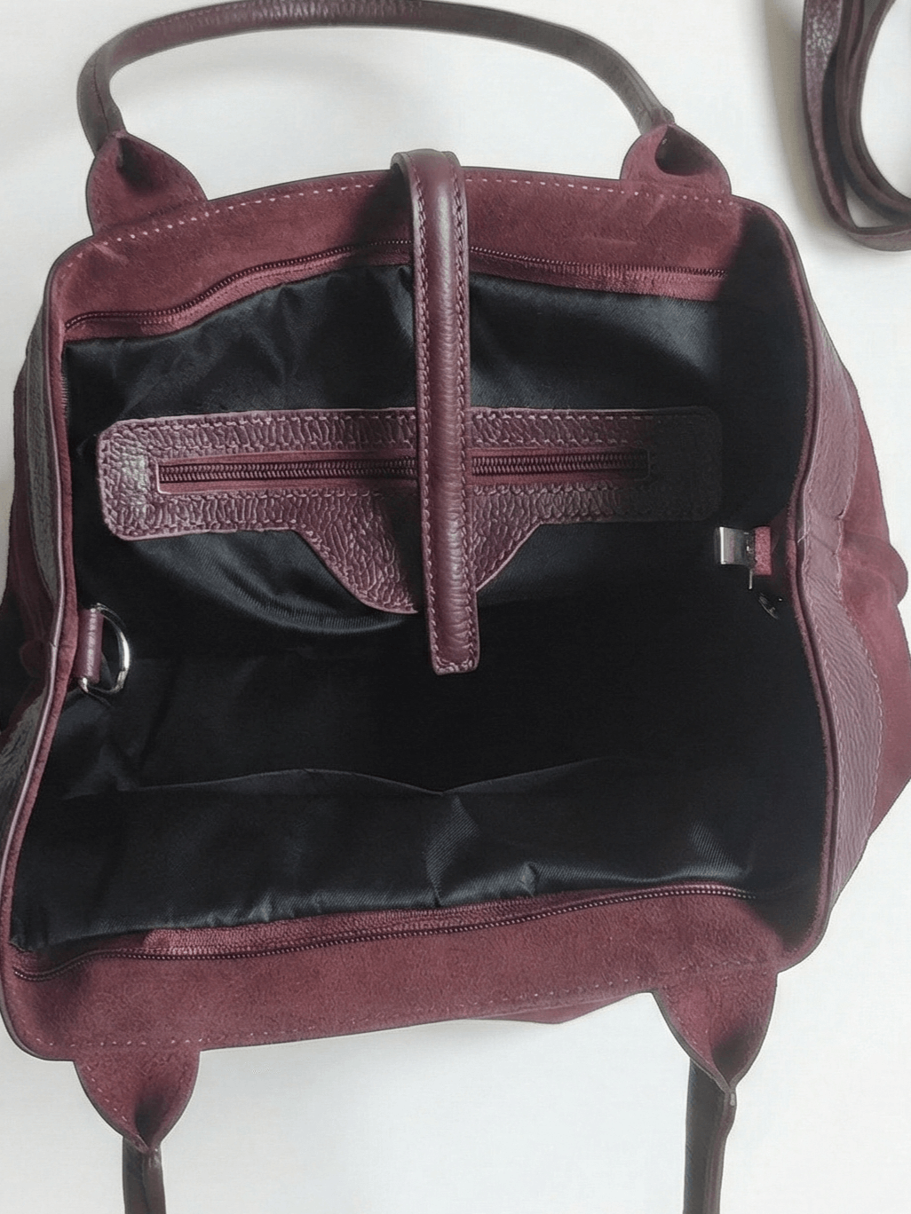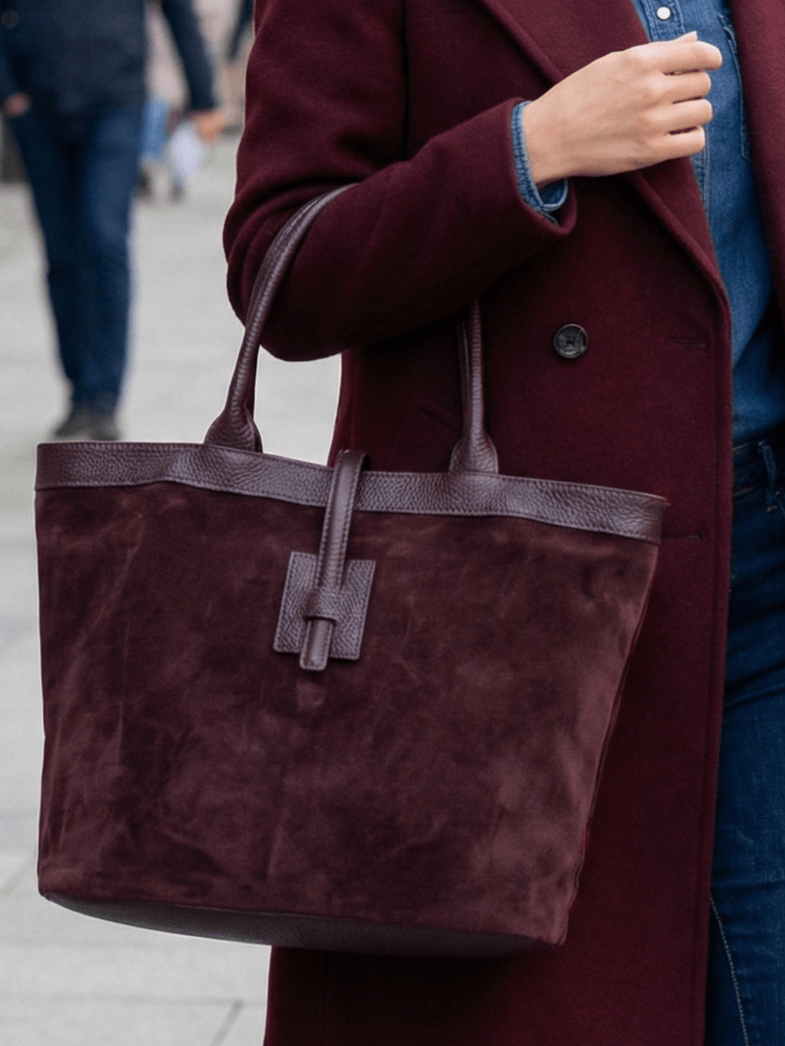 Италианска дамска чанта от естествен велур и кожа – Бордо класически модел с променяща се форма