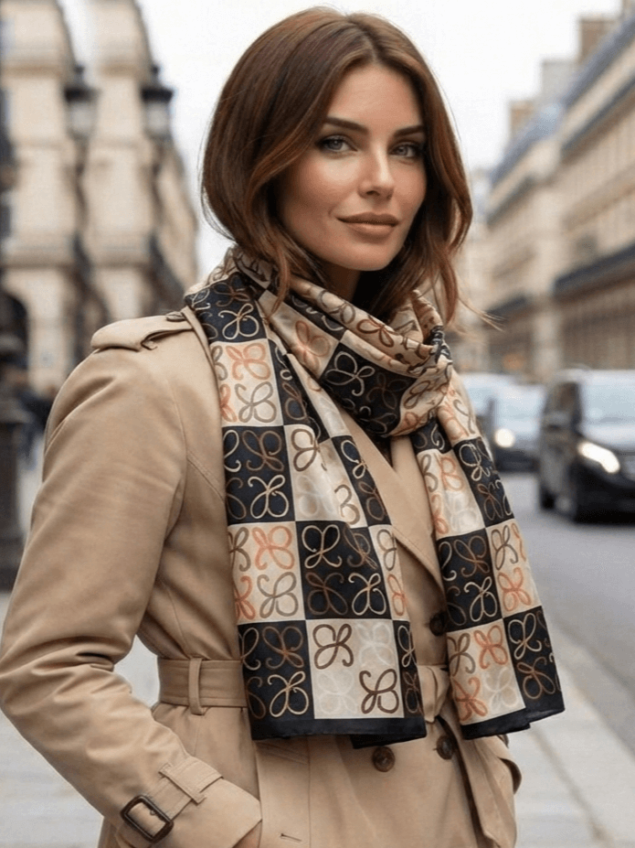 Впечатляващ дизайн: Класическият геометричен принт с повтарящи се мотиви в стил "монограм" придава луксозно излъчване. Цветовата палитра в бежово, карамел (camel) и черно го прави лесен за съчетаване с всеки тренчкот, палто или сако.