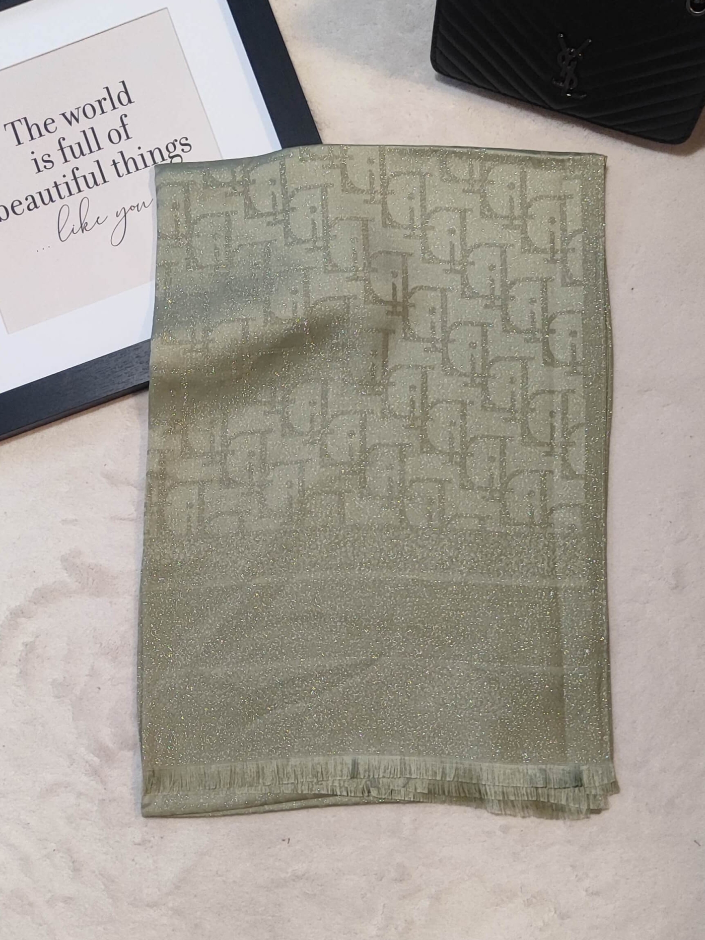 Акцентът на модела е втъканата фина лъскава нишка (ламе), която придава ненатрапчив, но луксозен блясък. Модерният десен с повтарящ се лого мотив го прави подходящ както за елегантно палто, така и като акцент към по-спортна визия с кожено яке.