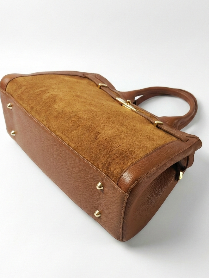 Елегантна италианска дамска чанта от естествена кожа и велур – Кафява