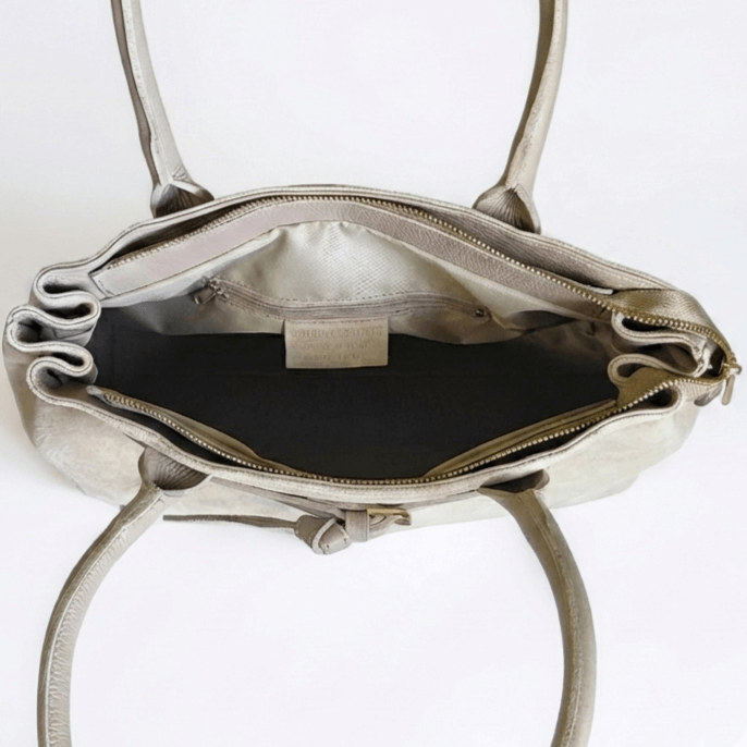 Добавете нотка италианска елегантност към ежедневния си или делови стил с тази изискана дамска чанта в светло бежово. Изработена с безкомпромисно качество в Италия, тя съчетава лукса на гладката естествена кожа (Vera Pelle) и мекотата на финия естествен велур.
