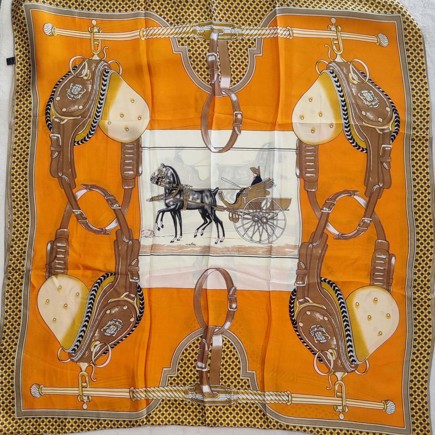 Добавете цвят и стил към гардероба си с този изискан сатенен шал в наситен оранжев нюанс. Дизайнът се отличава с детайлни ретро илюстрации и стилни преплетени елементи, които са красиво обградени от елегантен кант на точки.