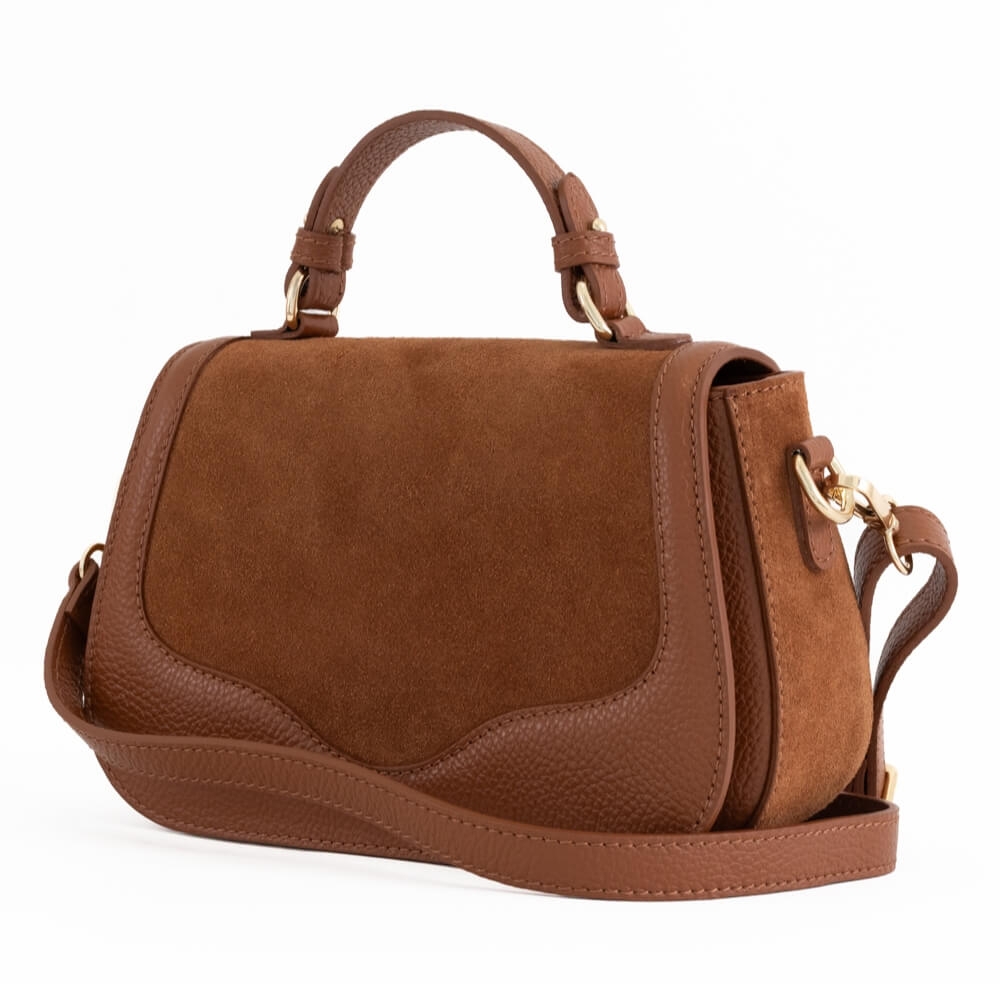 Изработена в Италия от 100% висококачествена телешка кожа в перфектна хармония с фино велурено покритие, тази чанта съчетава издръжливост и луксозно усещане. Дизайнът се отличава с красиви извивки, допълнени от блестящи метални елементи в златист тон, които придават завършеност на визията.