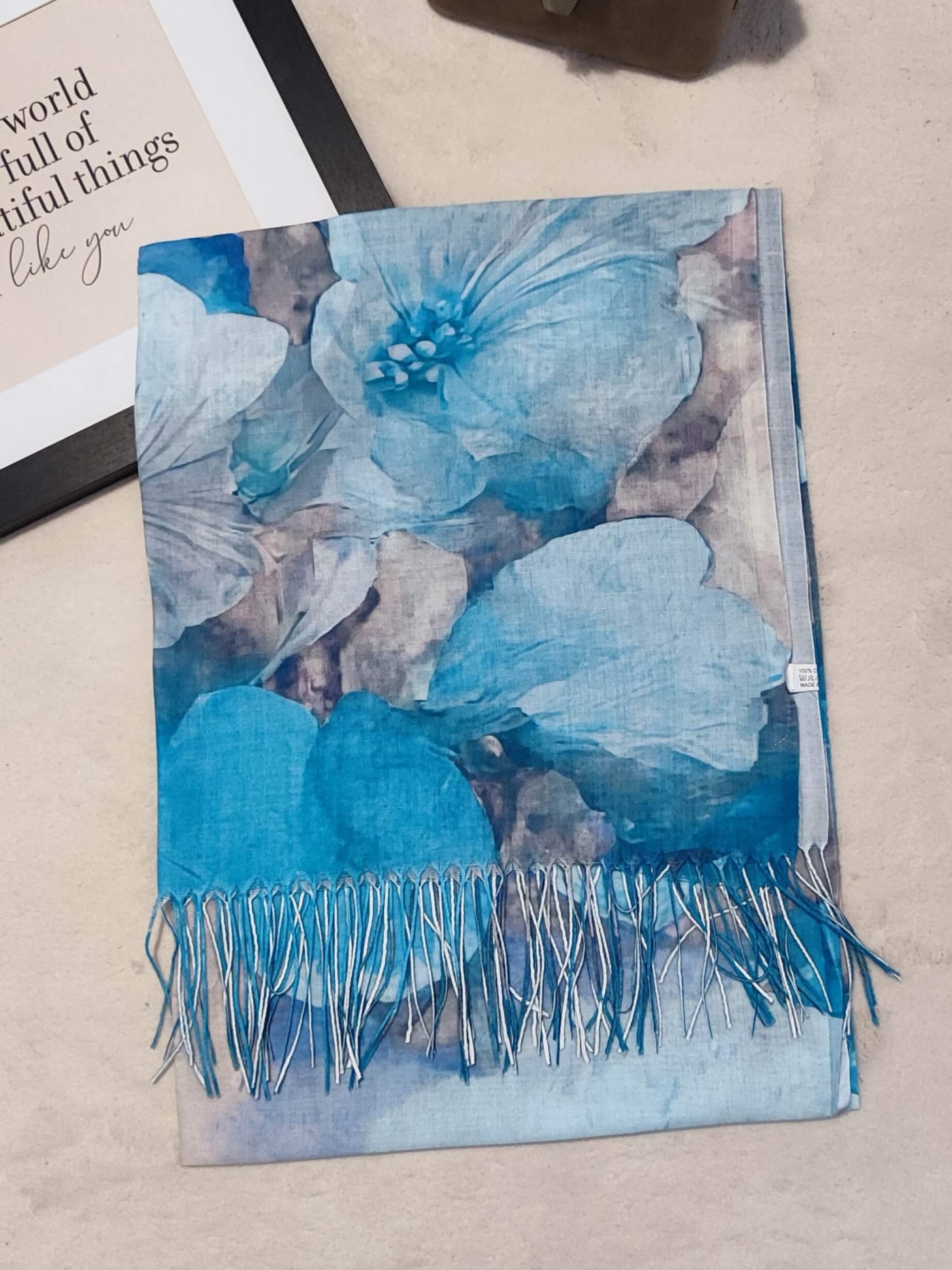 Освежете визията си с този памучен шал с живописен флорален принт и сини нюанси.