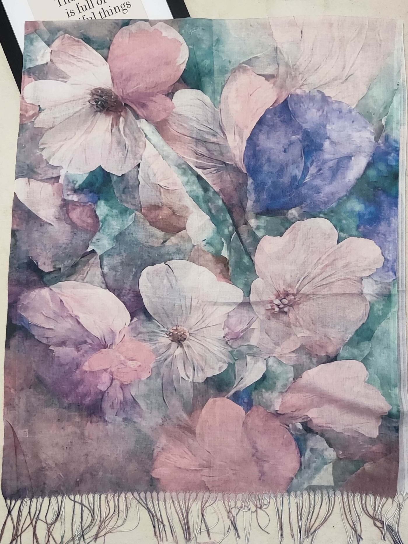 Добавете цвят и артистичност към всекидневието си с нашия дамски памучен шал с флорални мотиви в сини и розови нюанси. Изработен от 100% мек и дишащ памук, този шал е не само красив акцент, но и изключително удобен аксесоар за пролетно-есенния и летния сезон.
