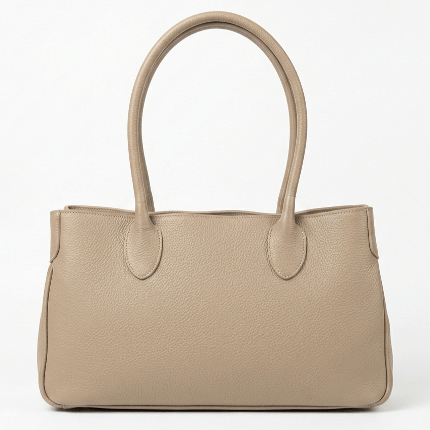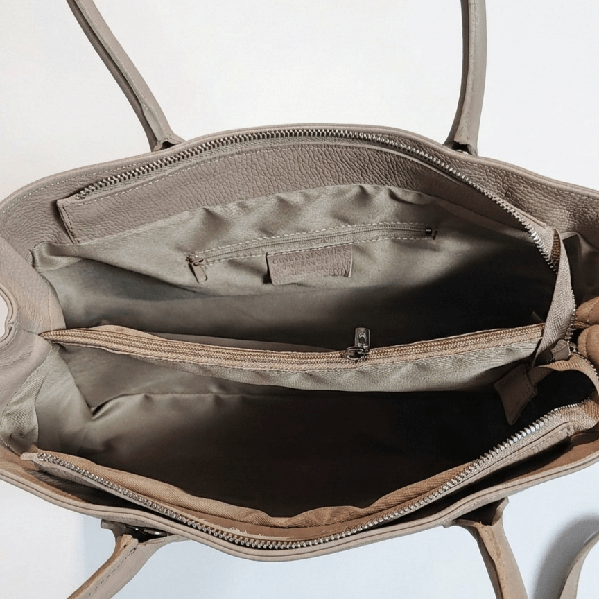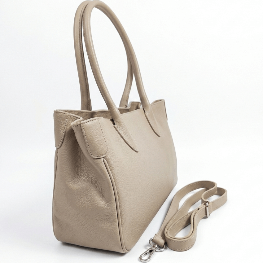 Добавете стил и удобство към ежедневието си с тази класическа дамска чанта. Изработена в Италия от висококачествена естествена кожа с красива зърнеста текстура, тя съчетава перфектно елегантен дизайн и отлична практичност. Неутралният ѝ бежов нюанс я прави лесна за комбиниране с всеки тоалет, а изчистената форма гарантира, че ще остане актуална сезон след сезон.