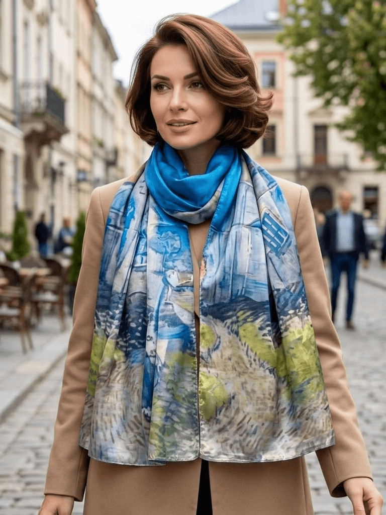 Внесете изтънченост и цвят в ежедневието си с нашия изключителен копринен шал. Този модел не е просто аксесоар, а истинско произведение на изкуството, което съчетава наситено сини нюанси със слънчеви акценти и градски мотиви.