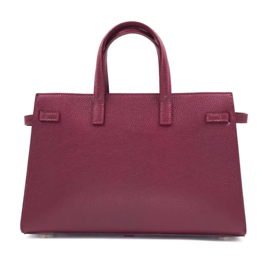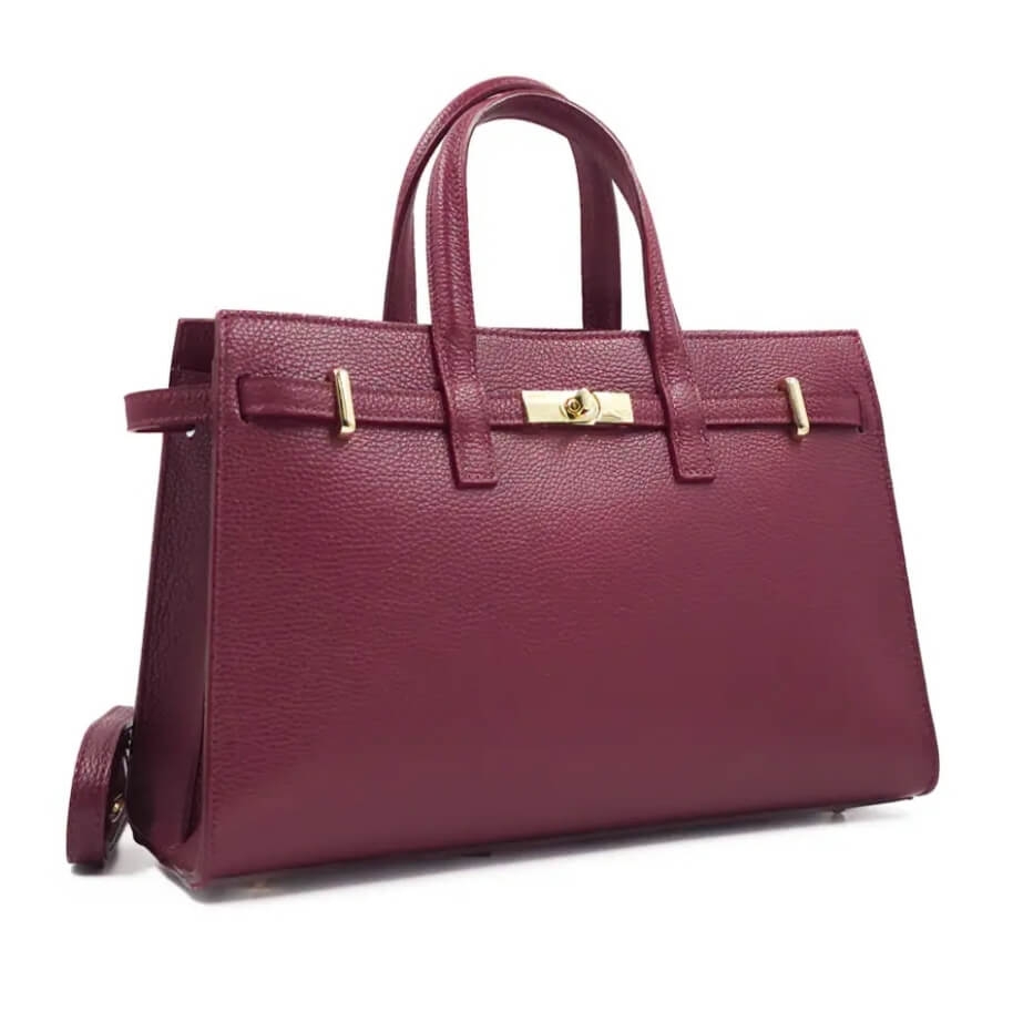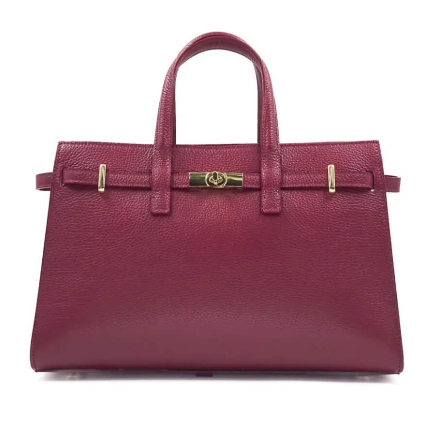 Дизайн и Изработка Изработена от висококачествена естествена кожа (Vera Pelle) с красива текстура, тази чанта в цвят бордо излъчва лукс и устойчивост. Строгият ѝ силует е подчертан от изящни златисти метални елементи и стилна закопчалка тип "въртящ се клипс" отпред.