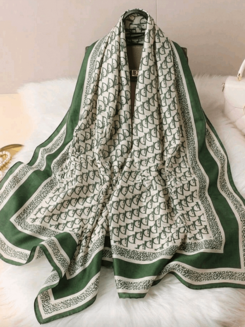 Открийте елегантността на нашия голям сатенен шал със зелен монограм принт в uniquefashion-online.com.
